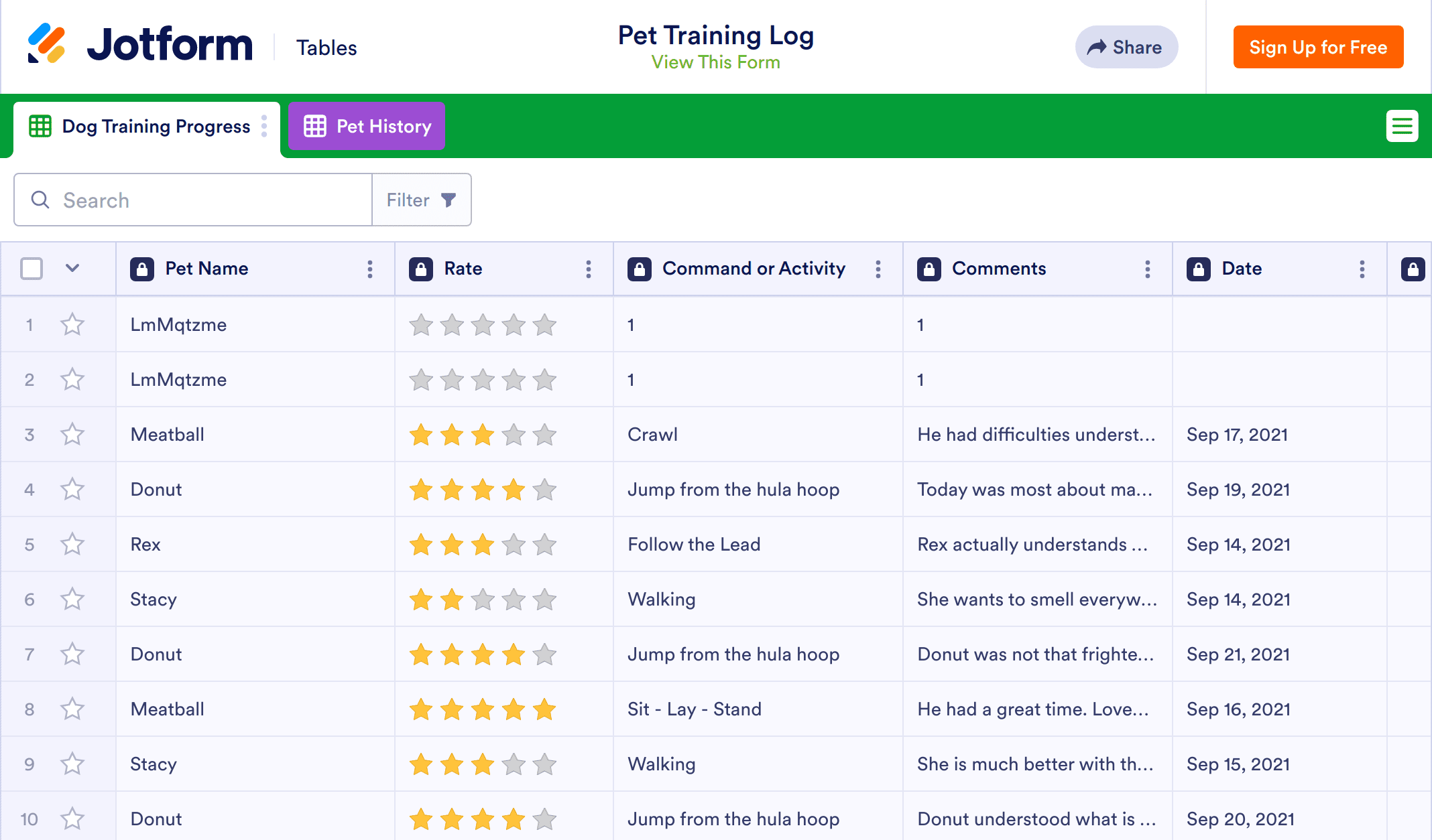 Are you running a dog training business? If so, how do you track the progress of the dogs? Well, here is a solution from us. Use this Pet Training Log to record all necessary information of the dogs, such as their breed type, age, behavior with the contact details of their owners. Also track their daily progress through an online Dog Training Progress Form that is fillable on field through any mobile device, anywhere and anytime. Each form submission will auto-populate the Pet Training Log in which you can access and edit through your laptop, mobile phone or tablet. You can also share progress reports with the pet owners. Start using Jotform now!
