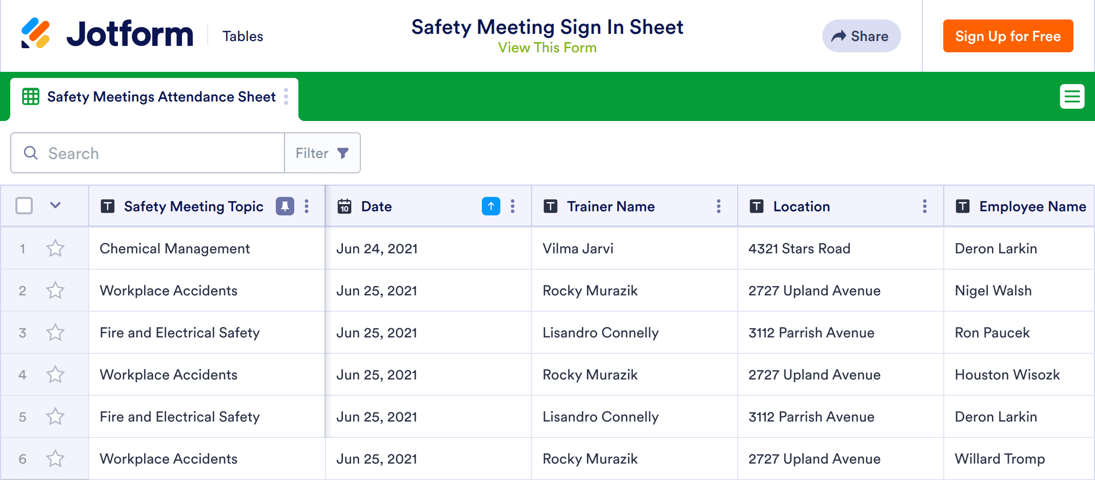A safety meeting sign-in sheet is used to keep track of which employees are attending a company’s safety meetings. Whether your meeting is about fire safety, electrical safety, or accidents in the workplace, you can use the form attached to Jotform’s online Safety Meeting Sign-In Sheet to collect participant info like employee name, date of attendance, and e-signature. Once you’ve received sign-in details, you can expertly manage them in Jotform Tables — viewable as a spreadsheet, calendar, or easy-to-read cards.