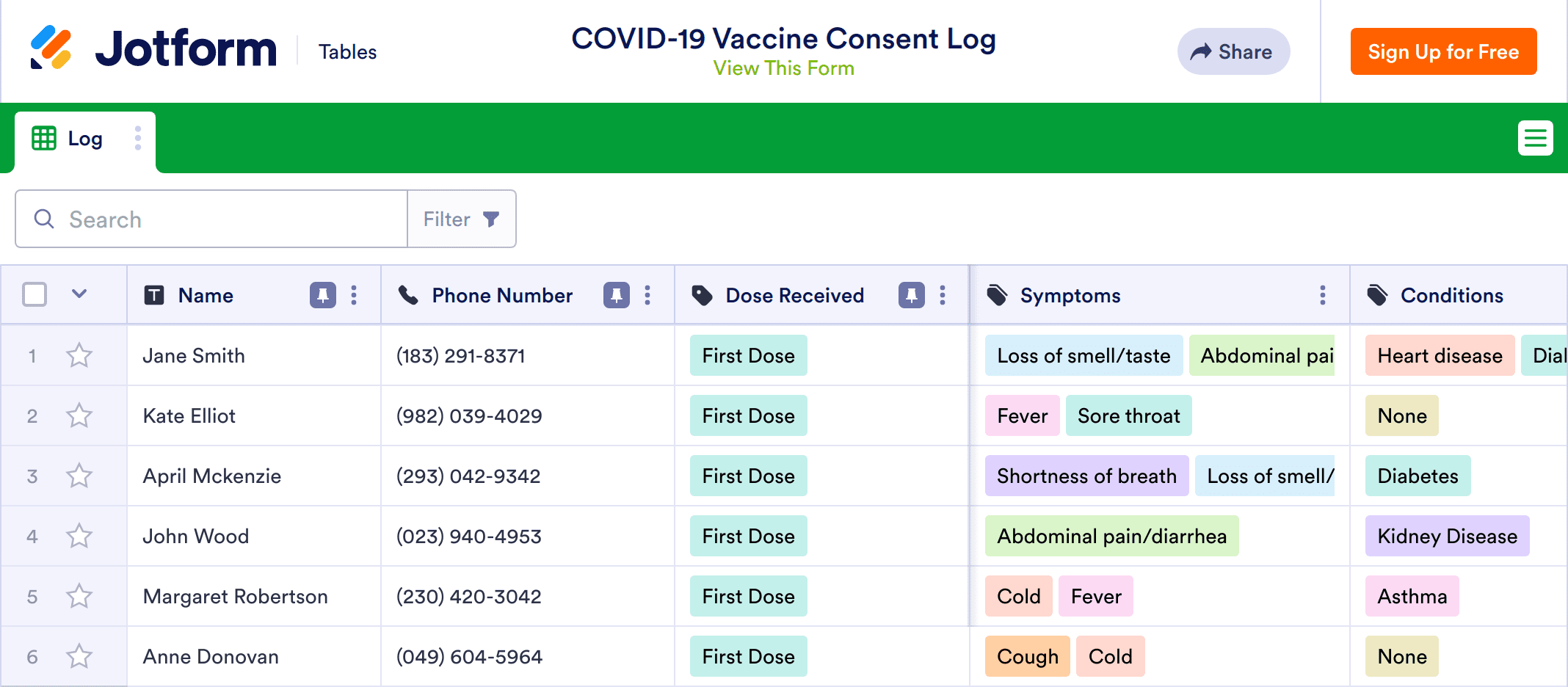 If your medical facility is distributing COVID-19 vaccines to eligible citizens, organize submissions through your consent forms or vaccine administration forms with our free COVID-19 Vaccine Consent Log Template. To get started, connect our COVID-19 Vaccine Consent Form or COVID-19 Vaccine Administration Record to this readymade log template. Using Jotform Tables, you’ll be able to view submissions as a spreadsheet database, calendar, or easy-to-read cards that you can easily share with other staff members.