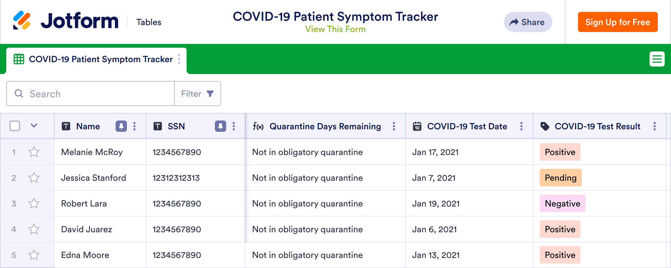 A COVID-19 patient symptom tracker is used by healthcare organizations, medical practices, and hospitals to keep track of patients’ coronavirus symptoms, test results, and more. With an online COVID-19 Patient Symptom Tracker, doctors and other medical professionals can expertly track patient contact details, test dates and results, symptom lists, temperatures, medications, and more in a professional spreadsheet-database platform.