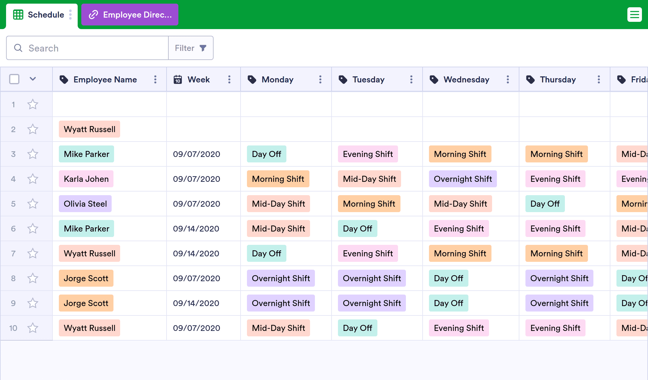 An employee schedule template helps an employer or manager keep track of employee shifts. Without any coding, our free online Employee Schedule Template will help you record and organize important employee information and their schedules. Simply enter shift details into the spreadsheet provided, or set up an employee schedule request form to automatically populate your sheet template with schedule data. You can easily view and edit the spreadsheet from any desktop or mobile device, and you’ll also be able to share and print it if needed.