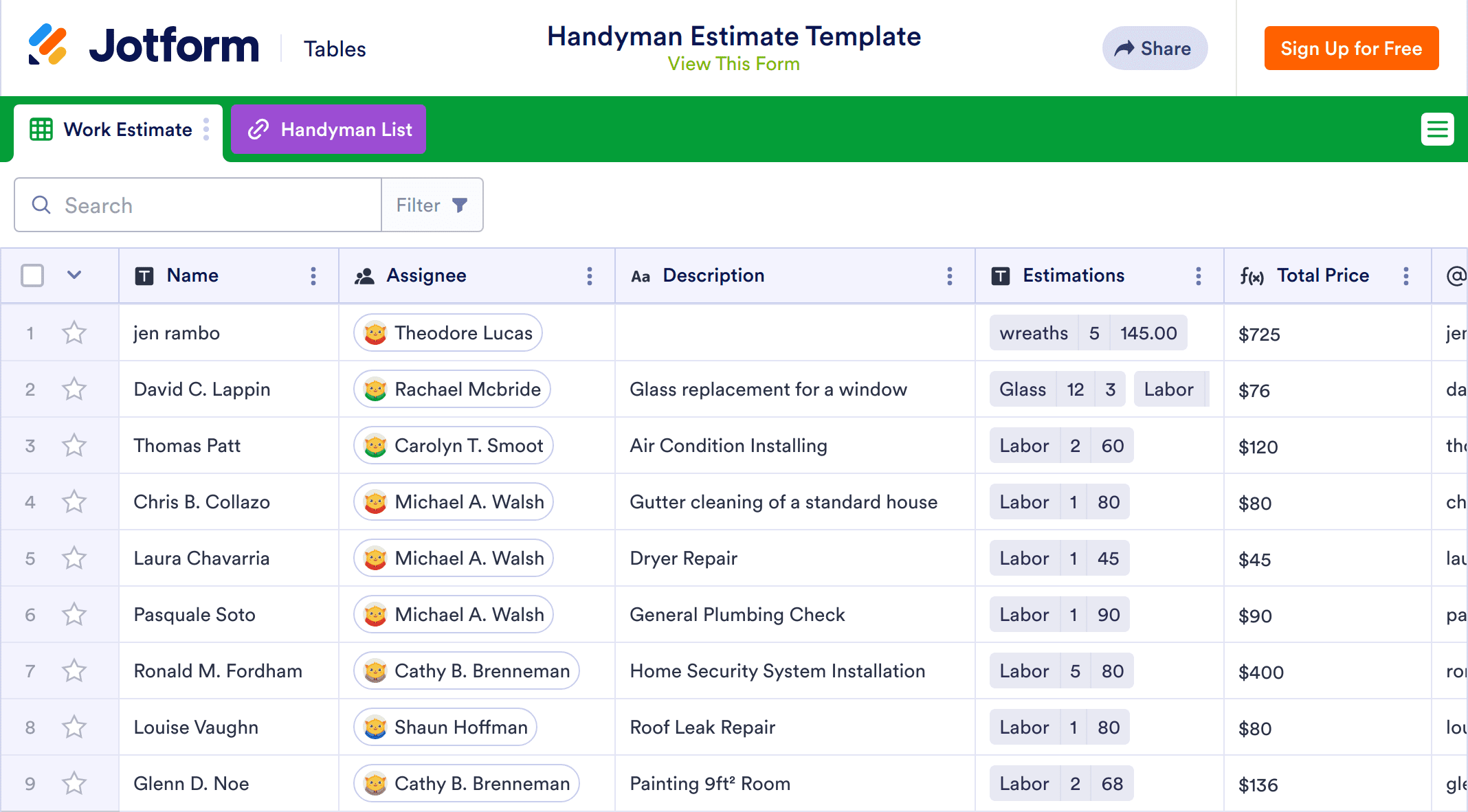 A handyman estimate template is used by independent mechanics, plumbers, and repairmen to determine and manage cost estimates for their clients. With this free Handyman Estimate Template, handyman businesses of all sizes can use an online spreadsheet to seamlessly track repair estimates for their clients. Just customize the spreadsheet template to suit your needs, enter your estimate information, and manage the spreadsheet details from any device — be it desktop computer, laptop, tablet, or smartphone.