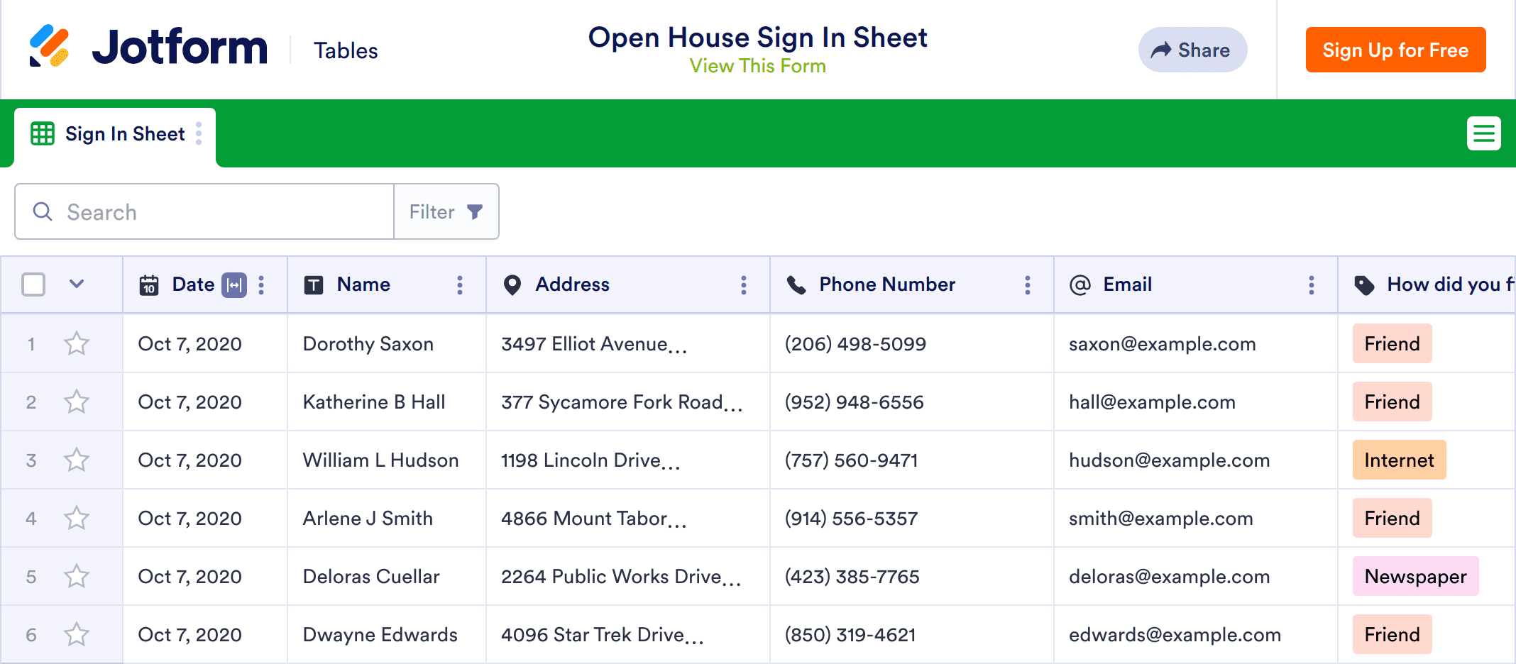 An open house sign-in sheet lets open house visitors sign their name and provide contact information to real estate agents. Real estate agents and realtors can use our free online Open House Sign-In Sheet to easily keep track of every person who stops by your open house. To get started, have visitors fill out the attached Open House Guest Registration Form on your tablet or their mobile devices. Submissions will automatically appear in your online table, which you can access and edit from any device.