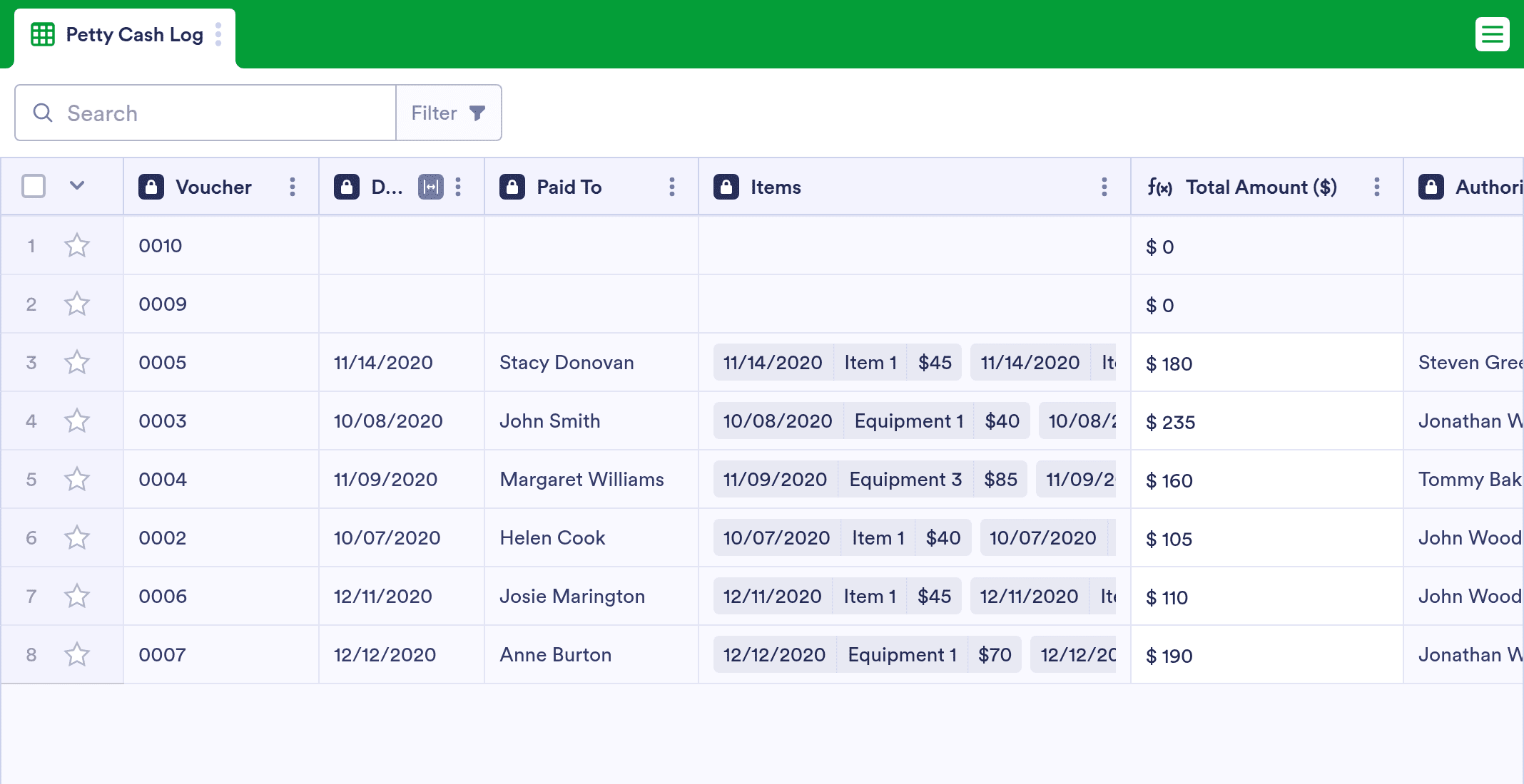 A petty cash log is used to keep track of petty cash payments for your business, nonprofit, or other type of organization. With Jotform’s free Petty Cash Log template, you can fill out the table manually, have employees fill out the attached petty cash form to automatically send petty cash payments to your table, or generate receipts for petty cash purchases with a PDF petty cash voucher template. You can even upload an existing CSV or Excel file to keep all of your petty cash payments in your secure Jotform account!