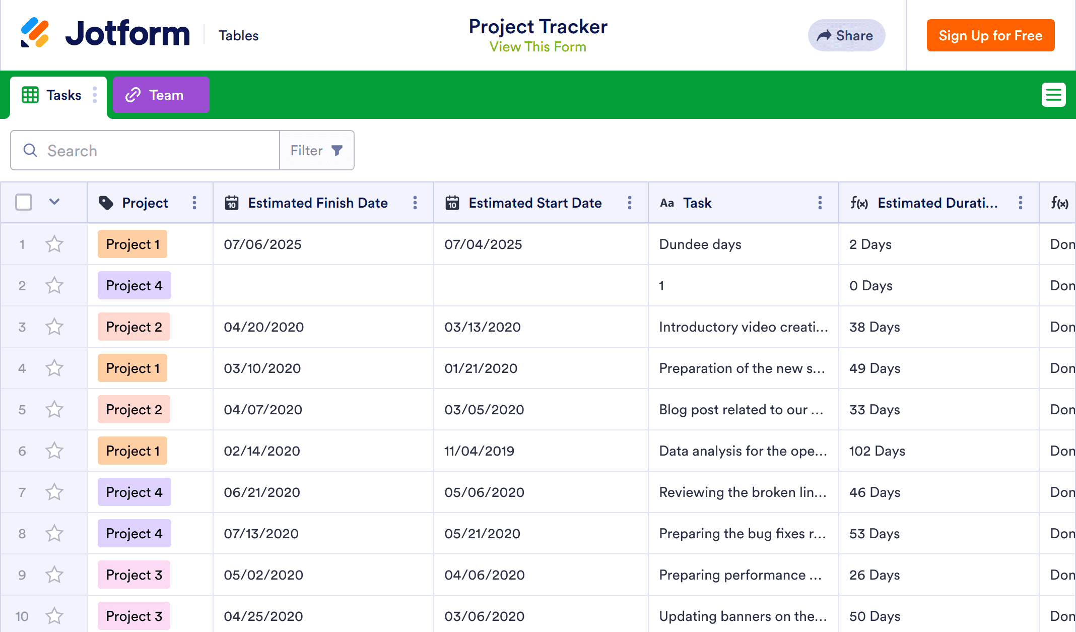 A project tracker template is used to manage project plans and scheduling, most often by employers responsible for multiple projects at once. Whether you want to adopt better project management practices for your company or simply want a way to organize your personal projects, Jotform’s free online Project Tracker will improve the way you manage projects and help you reach your goals. To get started, simply enter project details such as name, task, who the project has been assigned to, estimated start and finish dates and status into the spreadsheet.