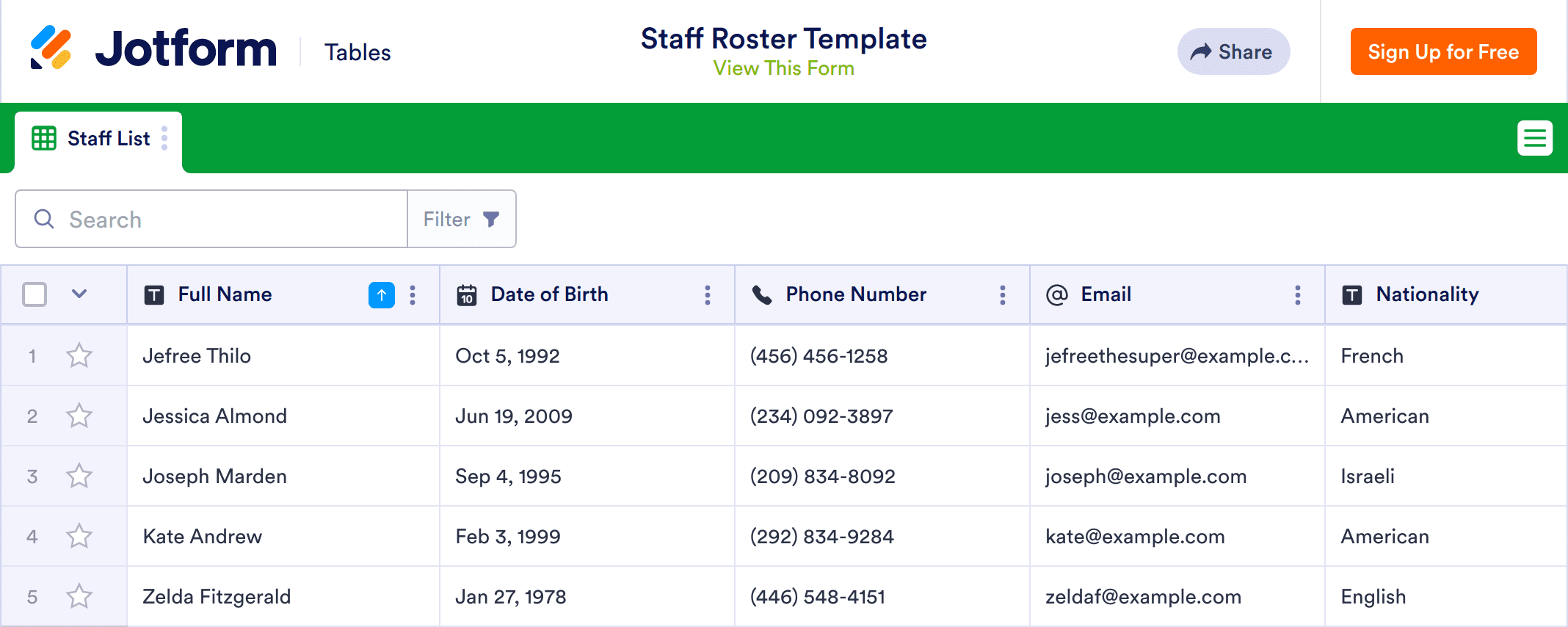 Would you like to customize this Staff Roster Template as you like it? Feel free to customize this Staff Roster Template to work for you by adding new rows and columns for additional information, splitting up information into separate tabs, or labeling information with color-coded tags. You can sync data to your other accounts automatically through Jotform’s integrations! Get organized with the help of this free online Staff Roster Template.