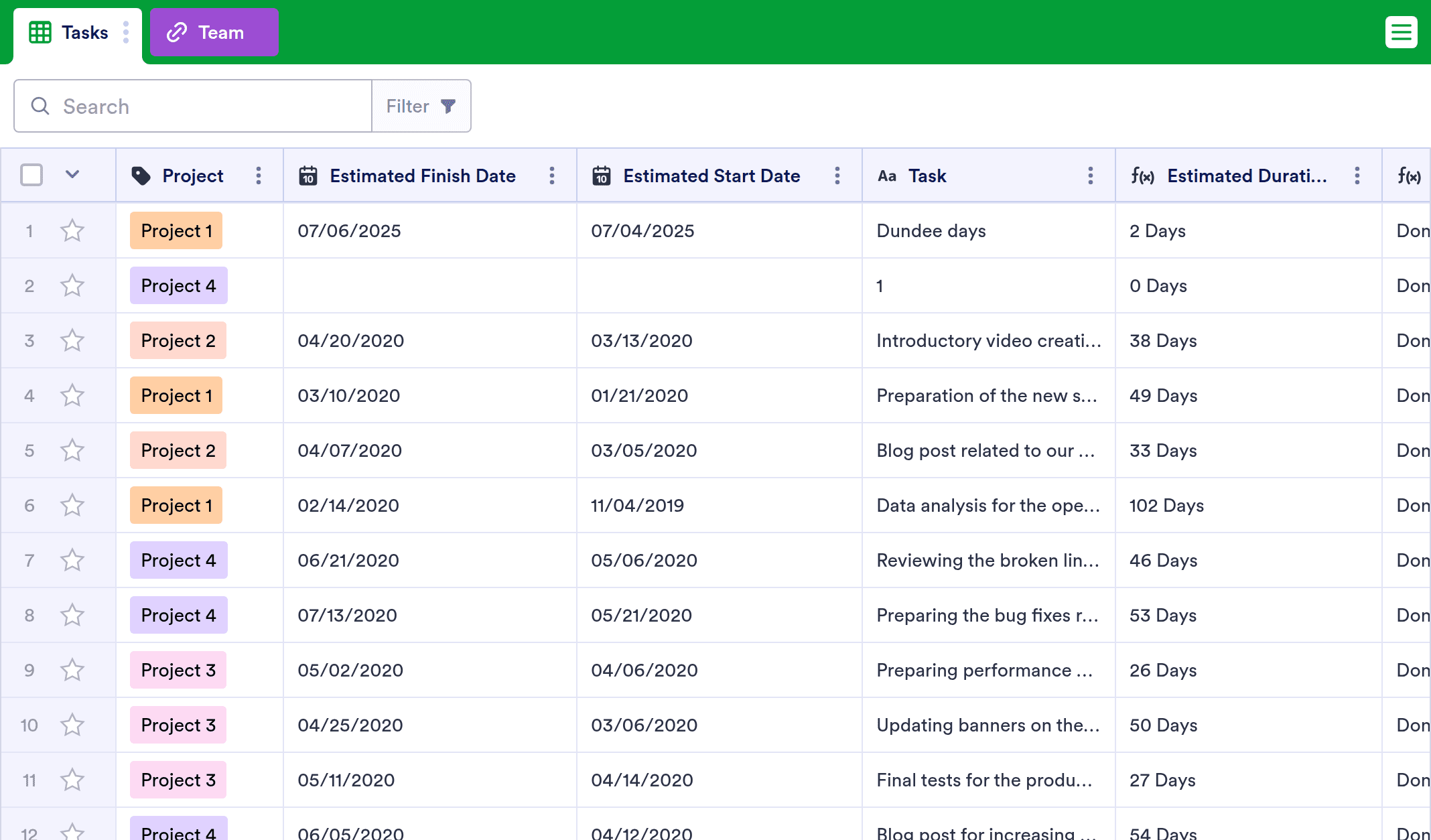 A project tracker template is used to manage project plans and scheduling, most often by employers responsible for multiple projects at once. Whether you want to adopt better project management practices for your company or simply want a way to organize your personal projects, Jotform’s free online Project Tracker will improve the way you manage projects and help you reach your goals. To get started, simply enter project details such as name, task, who the project has been assigned to, estimated start and finish dates and status into the spreadsheet.