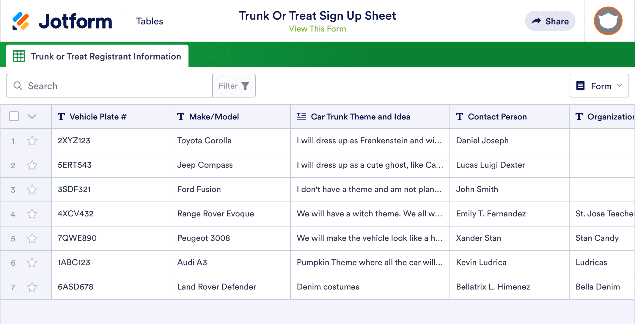 Do you know that you can fully customize this Trunk or Treat Sign Up Sheet to work for you by adding new rows and columns for additional information, splitting up information into separate tabs, or labeling information with color-coded tags? You can sync data to your other accounts automatically through Jotform’s integrations to follow the developments of the events! Get organized with the help of this free online Trunk or Treat Sign Up Sheet. All can be achieved without coding!