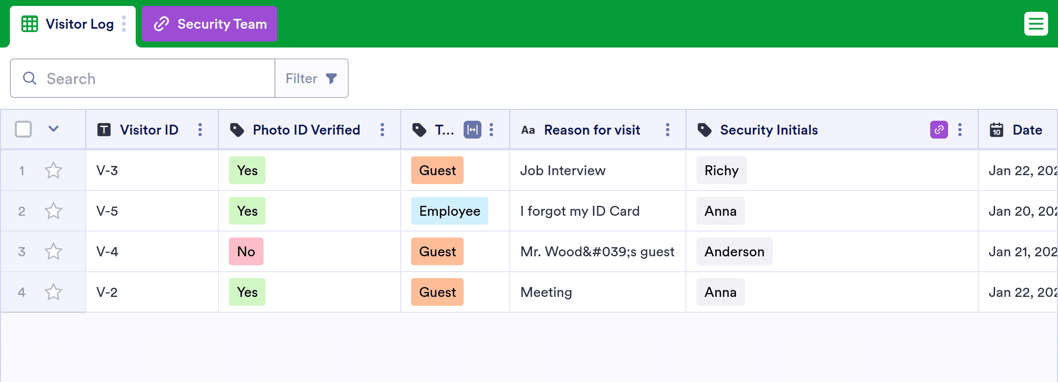Our Visitor Log is ready to start recording visitor ID numbers, names, photos, check-in times, the reason for visit, and signatures. Customize your security by adding more rows, columns, tabs, and labels to help your team keep better track of who goes in and out of your business. Trade your paper sign-in sheet for our digital Visitor Log — and upgrade your visitor management system for a modern workplace!
