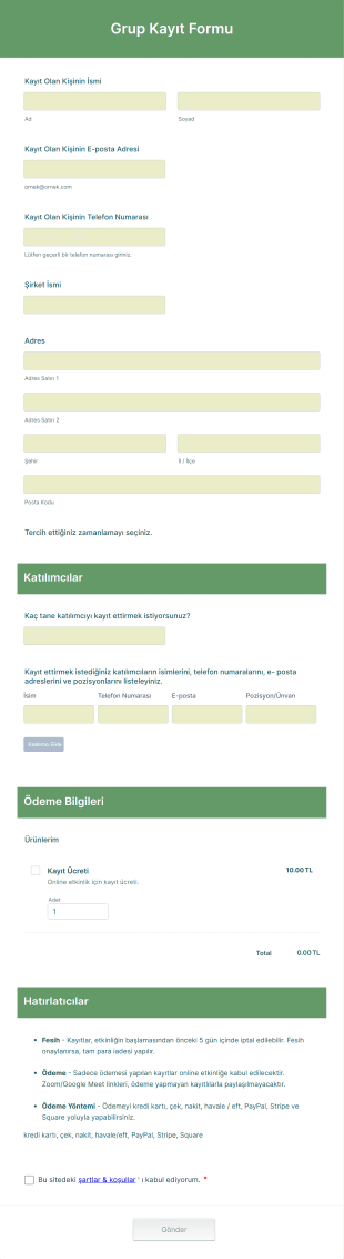 Bir Grup Kayıt AI Asistanı, etkinlik organizatörlerinin katılımcı kayıtlarını toplamak için tasarlanmış etkileşimli bir asistandır. Bu AI Asistanı, etkinlik katılımcılarından gerekli bilgileri, tercih ettikleri zaman dilimlerini ve iletişim bilgilerini toplayarak kayıt sürecini kolaylaştırır. Katılımcılar, kullanıcı dostu bir arayüz aracılığıyla etkinlik kaydı yaparken, organizatörler de kayıt işlemlerini daha verimli bir şekilde yönetebilir.
