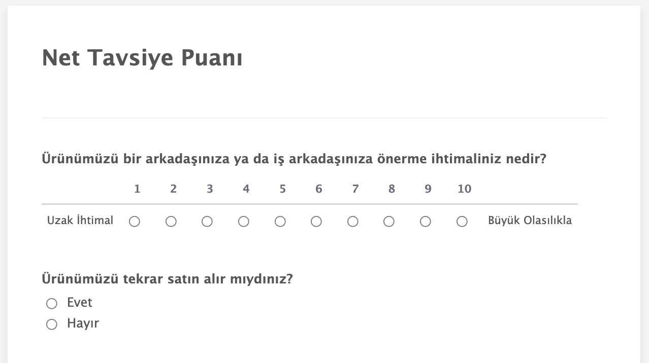 NPS, direkt olarak bir soruya verilen yanıt ile belirlenir: Müşterileriniz şirketinizi başkalarına tavsiye eder mi? Bu soru, online bir NPS anketi düzenlemeyi kolaylaştırır. Pahalı web sitesi tasarımları veya istatiksel bir bilgi birikimi gerektirmez.