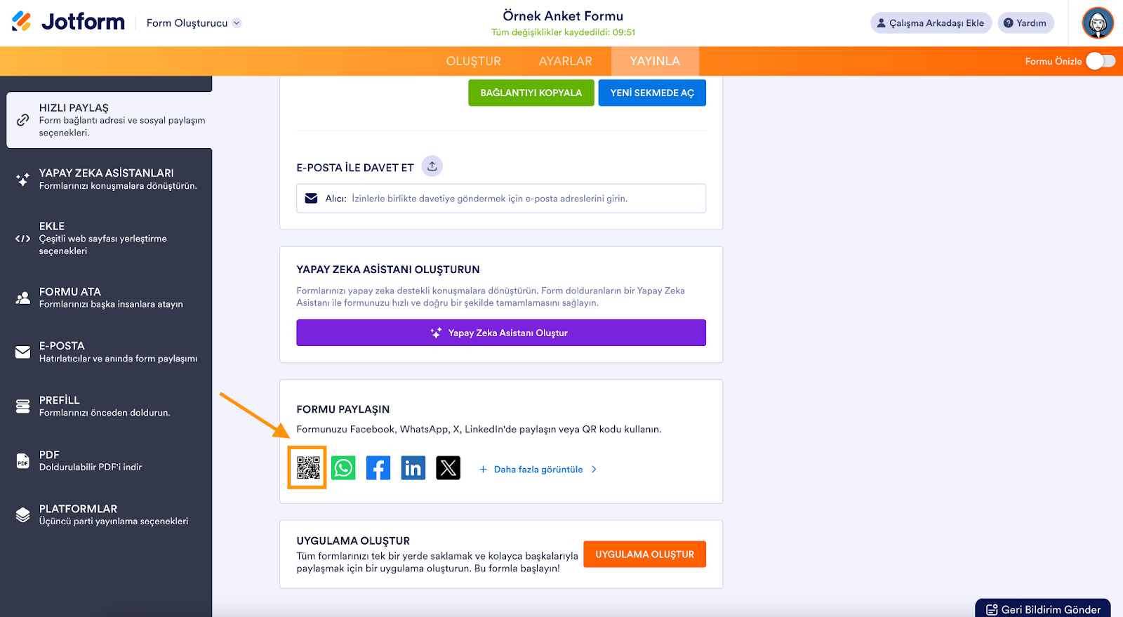 Jotform’da hazırladığınız anket için QR kodu oluşturmak istiyorsanız, Yayınla sekmesine gidin ve Hızlı Paylaş’a tıklayın. Açılan Paylaşım kutusunda QR kod simgesine tıklayın. QR kodunuzun görüntüsünü indirebilir ya da bir web sitesine yerleştirmek için kod parçacığını kopyalayabilirsiniz.