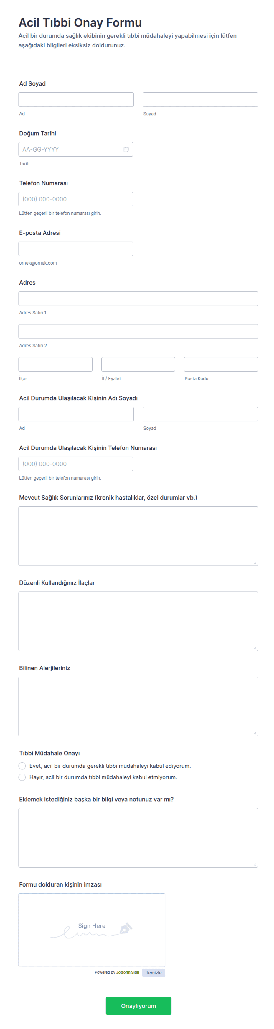 Ameliyat Onay ve Değerlendirme Formu, sağlık kurumlarının cerrahi işlem öncesi hasta bilgilerini toplamasına, onam metnini onaylatmasına ve imzalı rıza kayıtlarını Jotform üzerinden güvenle saklamasına yardımcı olur.