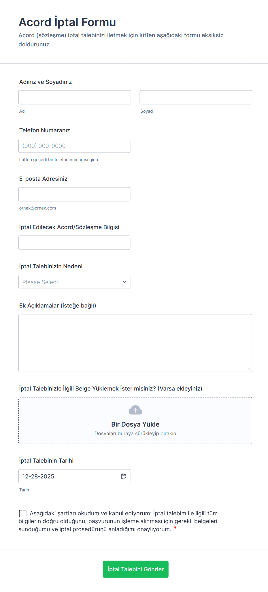- Gerekli alanlar farklılık gösterebilir: iletişim bilgileri, iptal nedeni, son hizmet tarihi, geri bildirim ve şartları kabul gibi.