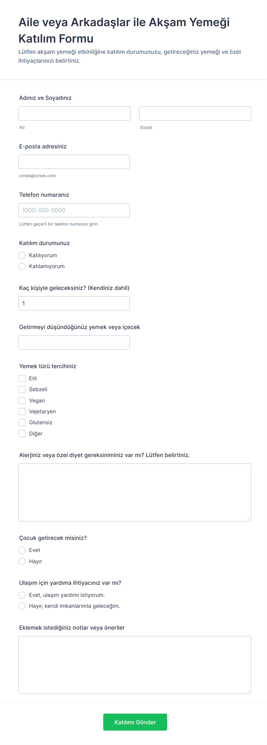 - Gündelik buluşmalar için basit bir evet/hayır katılım alanı ve iletişim bilgileri yeterli olabilir.