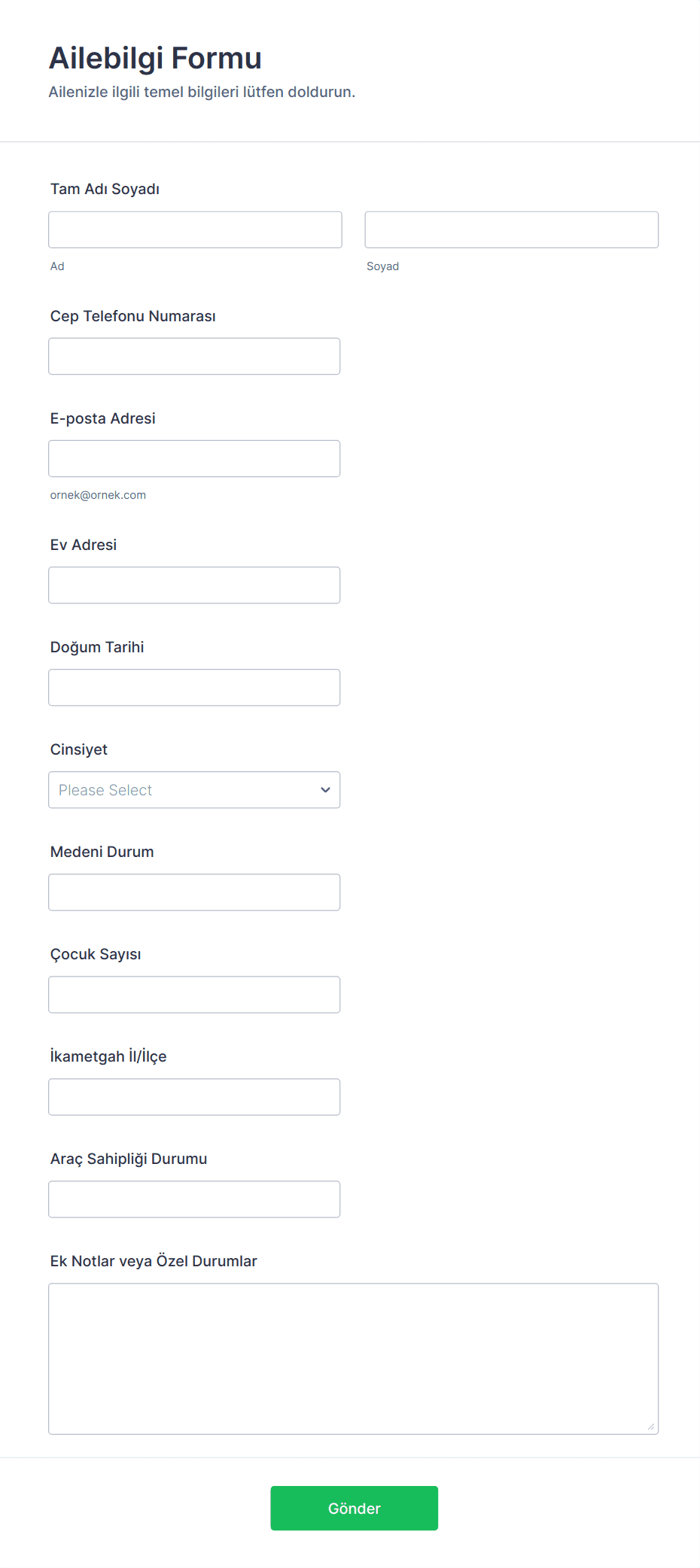 Yaygın alanlar arasında isim, e-posta, telefon numarası, adres ve belirli kullanım durumuna ilişkin tercihler, geribildirim veya onay gibi diğer detaylar bulunur.