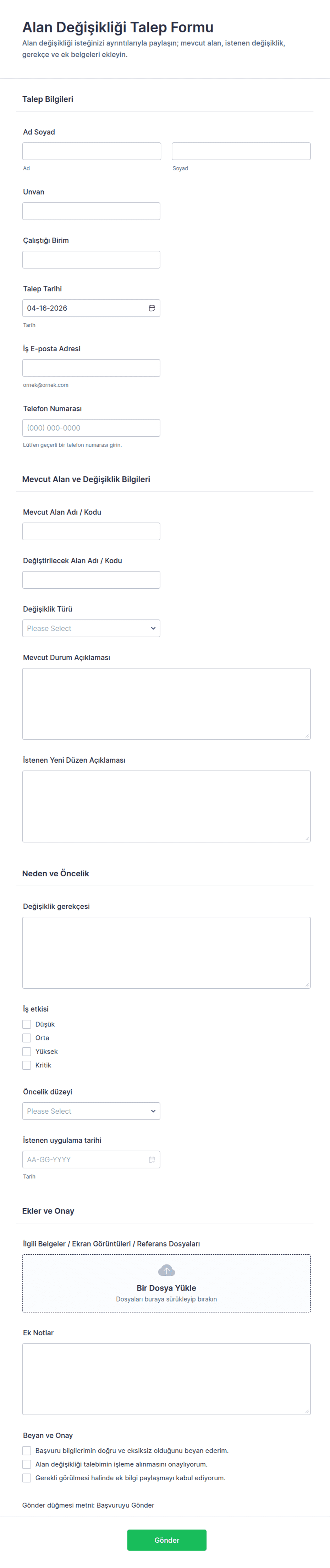 Alan Değişikliği Talep Formu, ekiplerin kurum içi alan güncelleme taleplerini öncelik ve planlanan uygulama tarihine göre toplayıp takip etmesine yardımcı olan Jotform form şablonudur.