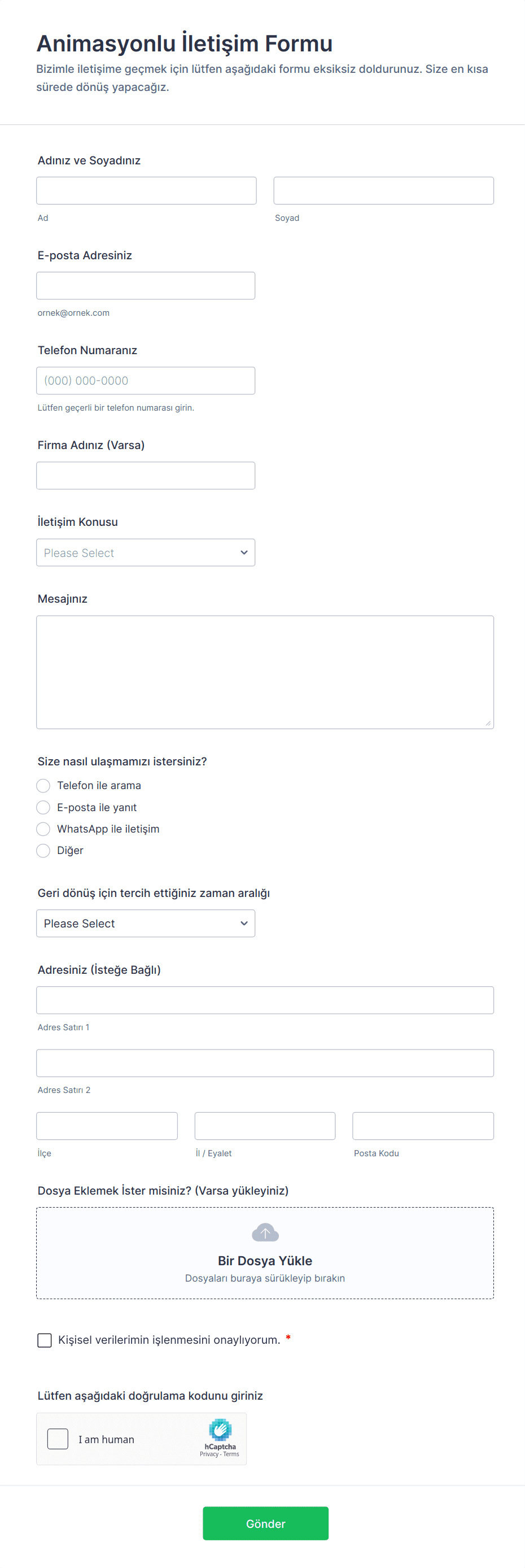 - Genel bir iletişim formu yalnızca temel alanları (ad, e-posta, mesaj) gerektirebilir.