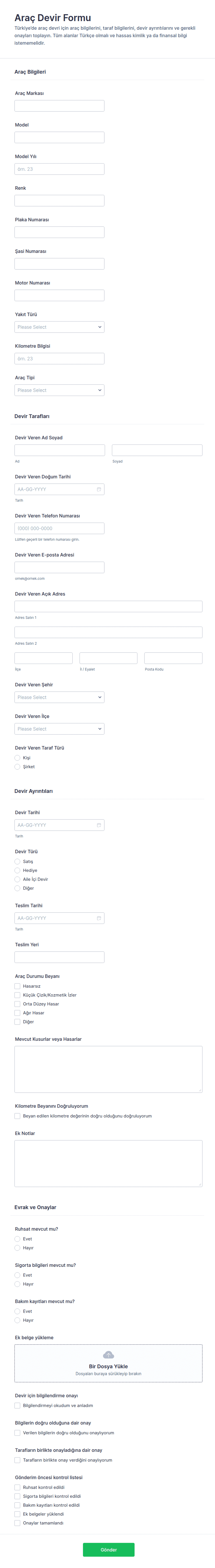 Otomotiv formu, otomotiv işletmelerinin araçlar, müşteriler, hizmetler, kiralamalar ve daha fazlasıyla ilgili bilgileri toplamak, yönetmek ve işlemek için kullandığı dijital bir belgedir.