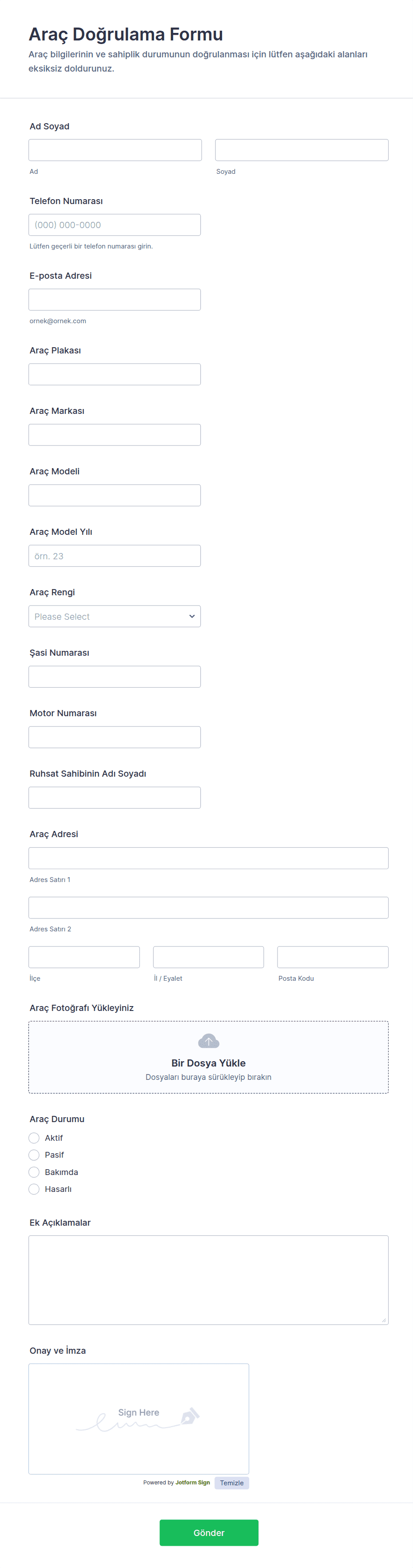 Araç Doğrulama Formu ile araç bilgilerini ve doğrulama kayıtlarını tek bir yerde toplayın, Jotform ile online veri toplama sürecini hızlandırarak ekiplerin kontrol ve takip işlerini kolaylaştırın.