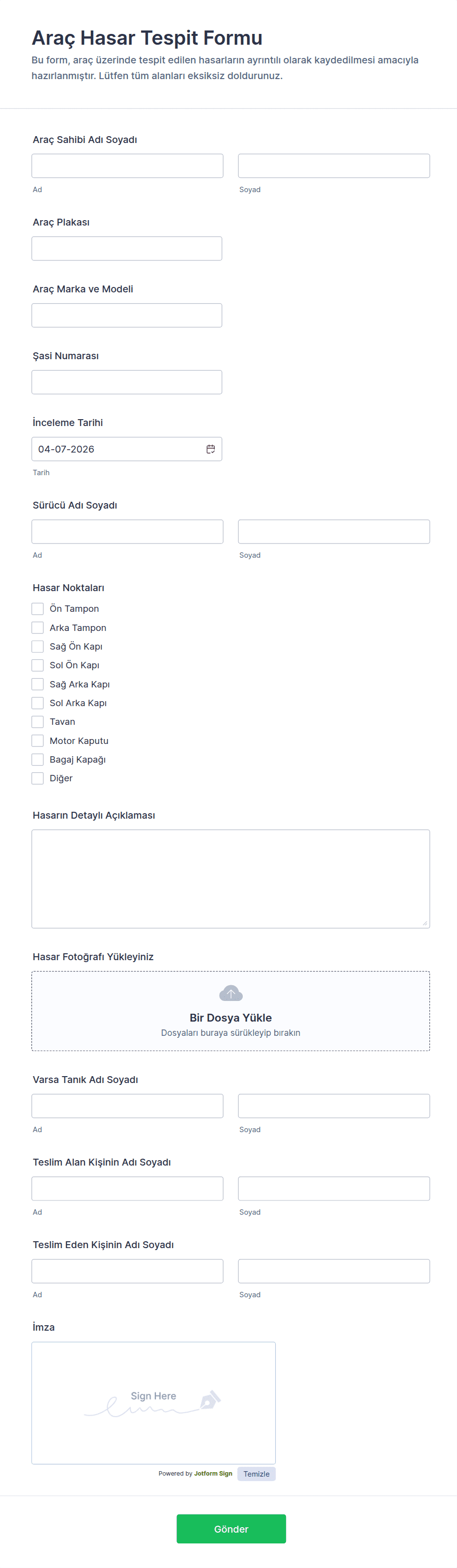 Yaygın alanlar arasında müşteri iletişim bilgileri, araç bilgileri (marka, model, yıl, VIN), hizmet veya kiralama detayları, ödeme bilgileri ve dijital imzalar bulunur.