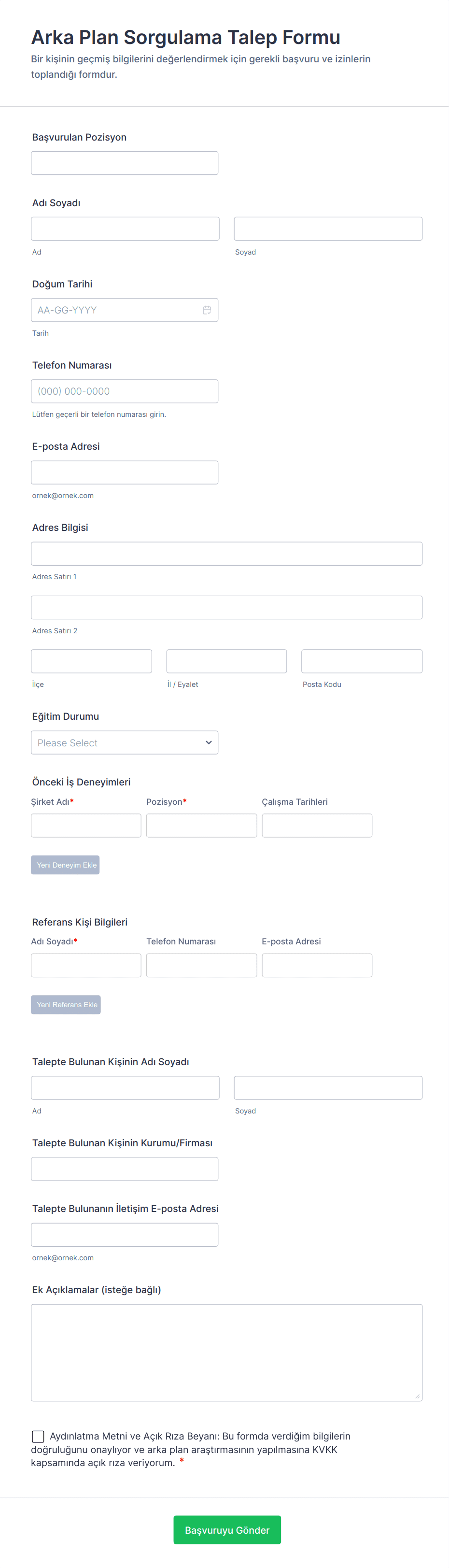 - İstihdam Doğrulaması: İşveren iletişim bilgileri, çalışma tarihleri ve referans mektupları için alanlar içerir.
