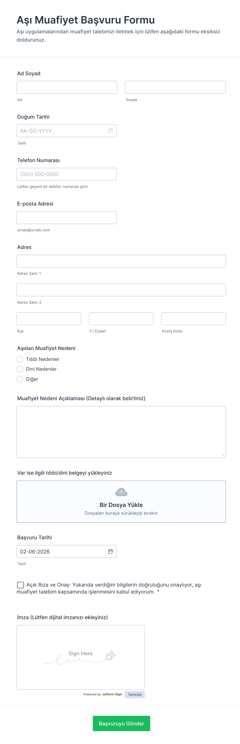 Tıbbi konsültasyon formu, hekimler tarafından hastalara sağlıkları ve ilgili hastalıkların geçmiş deneyimleri hakkında danışmak için kullanılan tıbbi bir ankettir. Tıbbi sorularınıza yanıt almak ve hastalarınızın kendi sağlık yönetimlerine dahil olmalarını sağlamak için ücretsiz Tıbbi Danışma Formu şablonumuzu kullanın. Hasta yanıtlarını Müşteri İlişkileri Yönetimi’nizde veya tercih ettiğiniz depolama hizmetinde takip edebilir ya da iş e-postanıza gönderebilirsiniz. Hastalarla geçirdiğiniz zamanı en iyi şekilde değerlendirmenizi ve hastalarınıza mümkün olan en iyi bakımı sağlamak için gereken bilgilere sahip olmanızı sağlamanın harika bir yoludur.Jotform, logo ekleyerek, form alanlarını güncelleyerek, soruları çeşitlendirerek, yeni yazı tipleri ve renkler seçerek, sürükle-bırak Form Oluşturucu ile e-imza ekleyerek ve herhangi bir kodlama gerektirmeyen, kullanımı kolay bir arayüzle kolayca özelleştirilebilir. Jotform aracılığıyla ilerlemenizi hızlandırın. Formunuzu web sitenize kolayca yerleştirin veya URL aracılığıyla paylaşın.