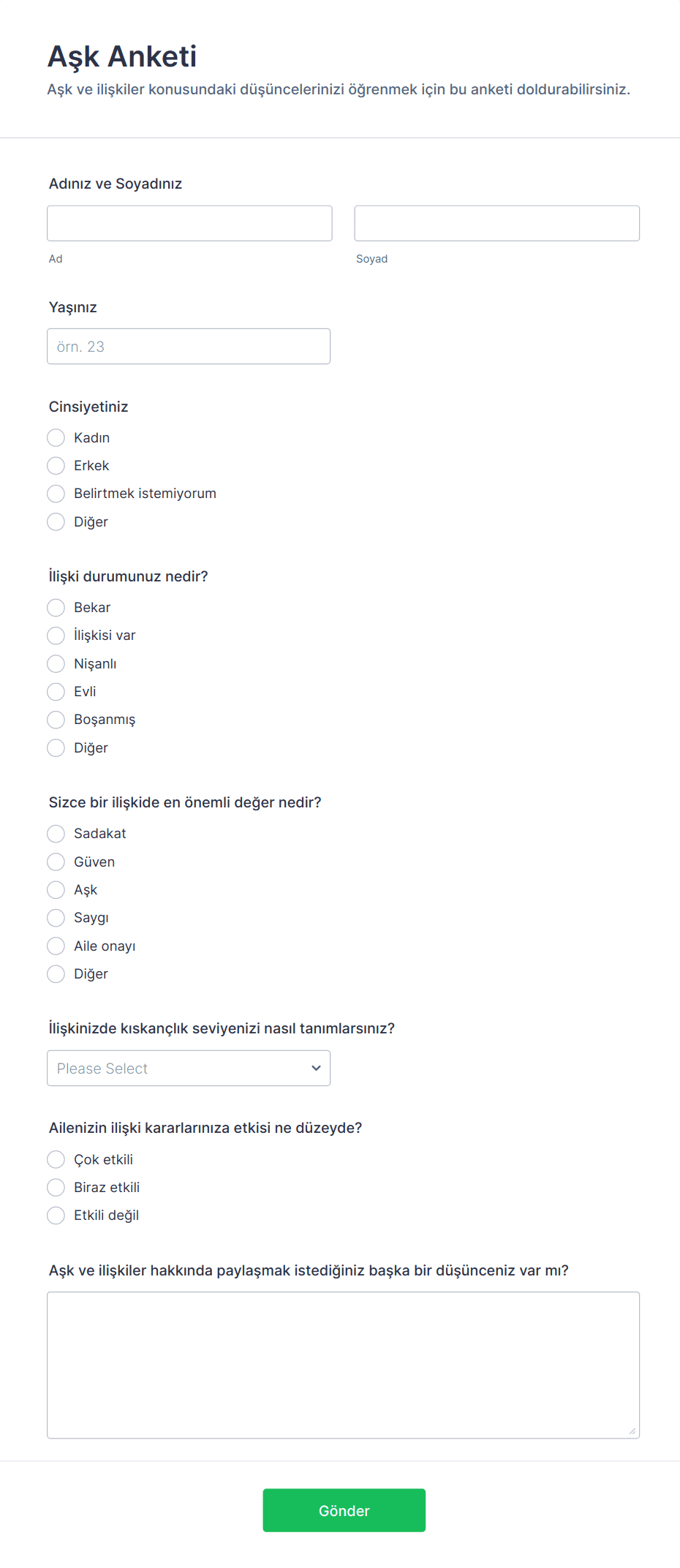 - İlişkinizde iletişimden ne kadar memnunsunuz? gibi Çoktan Seçmeli veya Derecelendirme Ölçeği soruları