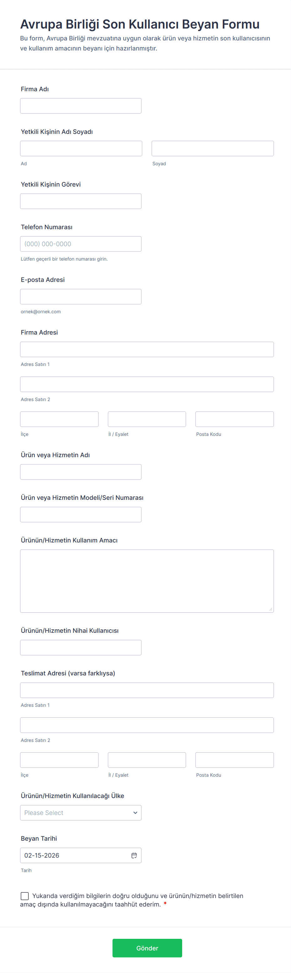 Genel alanlar arasında kişisel bilgiler, beyan ifadesi, onay için işaret kutuları, e-imza alanları ve gönderim tarihi bulunur. Özel kullanım durumuna göre ek alanlar eklenebilir.