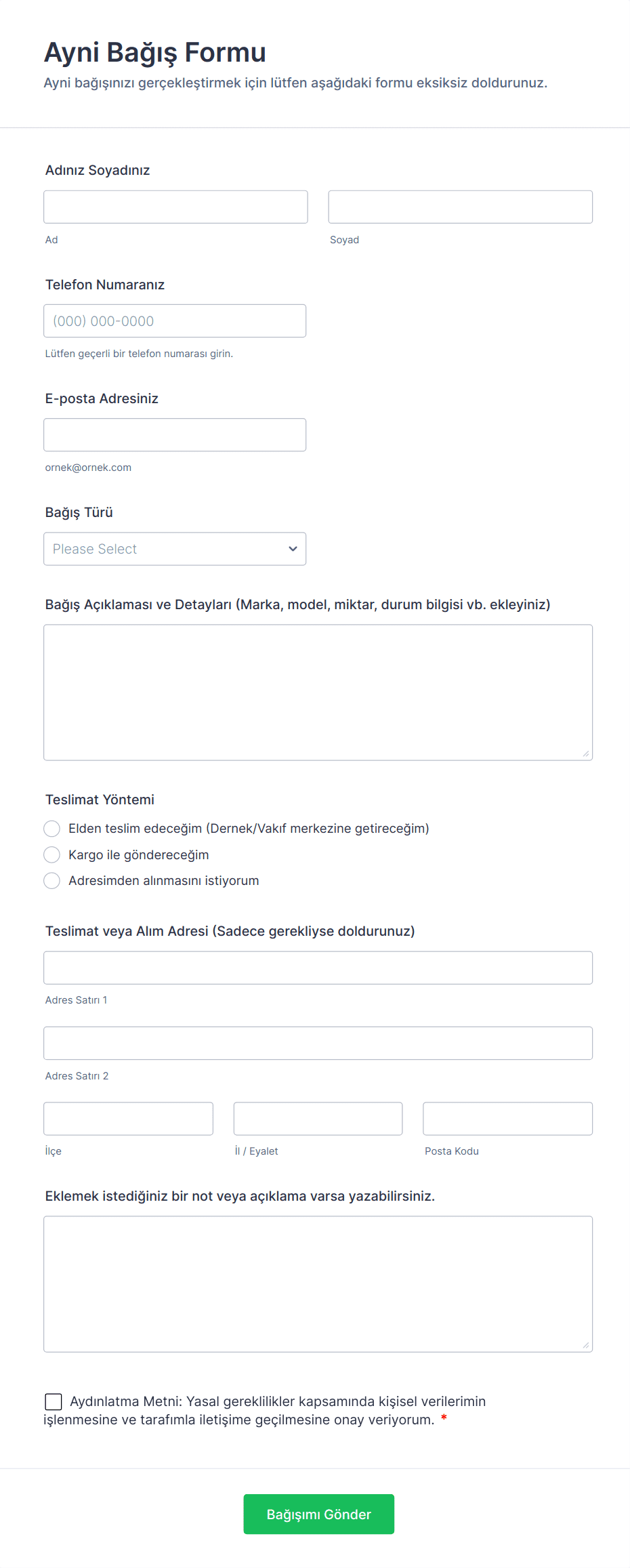 - Bağışçı adı ve iletişim bilgileri (e-posta, telefon, adres)