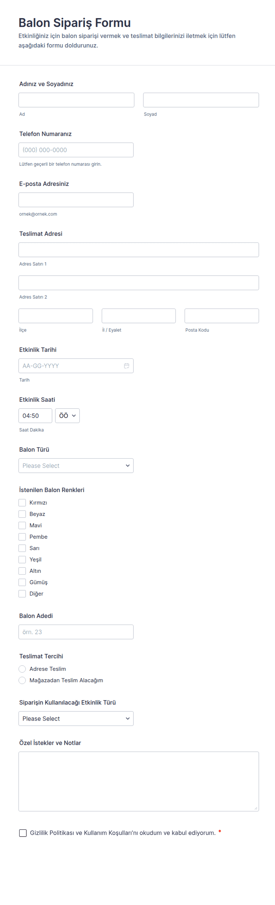 Ürün sipariş formu; ürün seçimleri, miktarları, ödeme ve teslimat detayları dahil olmak üzere müşteri siparişlerini toplamak için kullanılan bir online formdur.