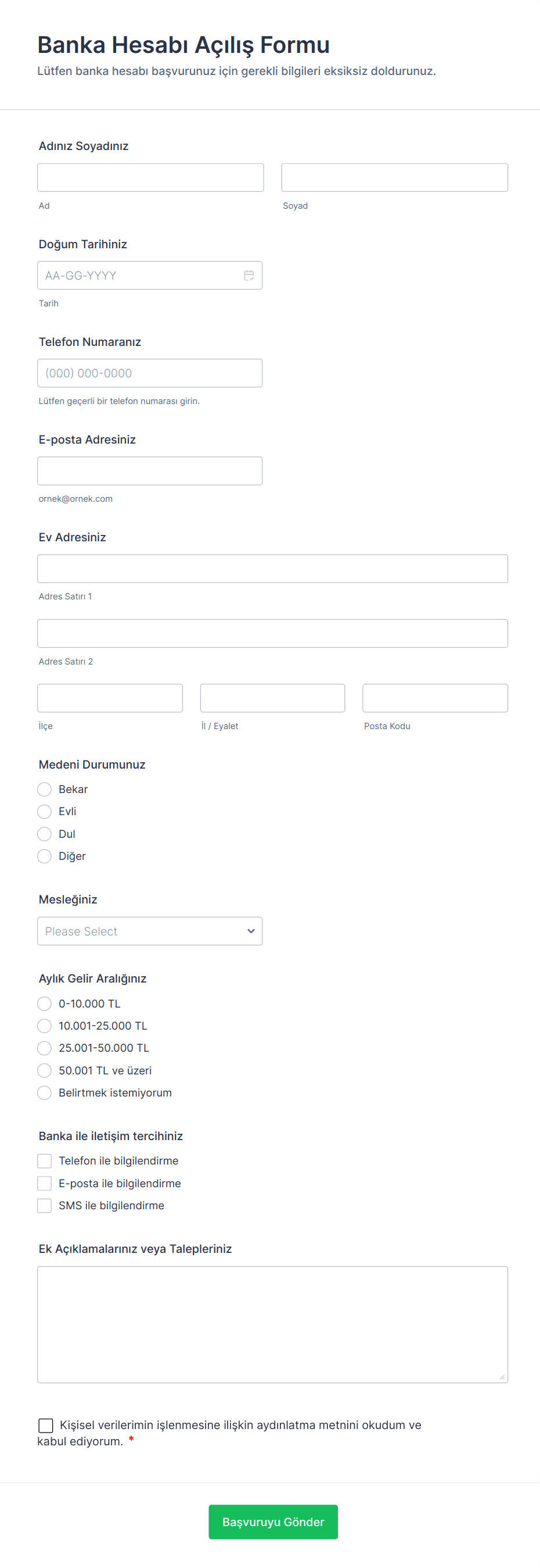 - Bu adımları izleyerek, kurumunuzun süreçlerini kolaylaştıran ve müşteri deneyimini geliştiren profesyonel, güvenli ve verimli bir banka başvuru formu oluşturabilirsiniz.