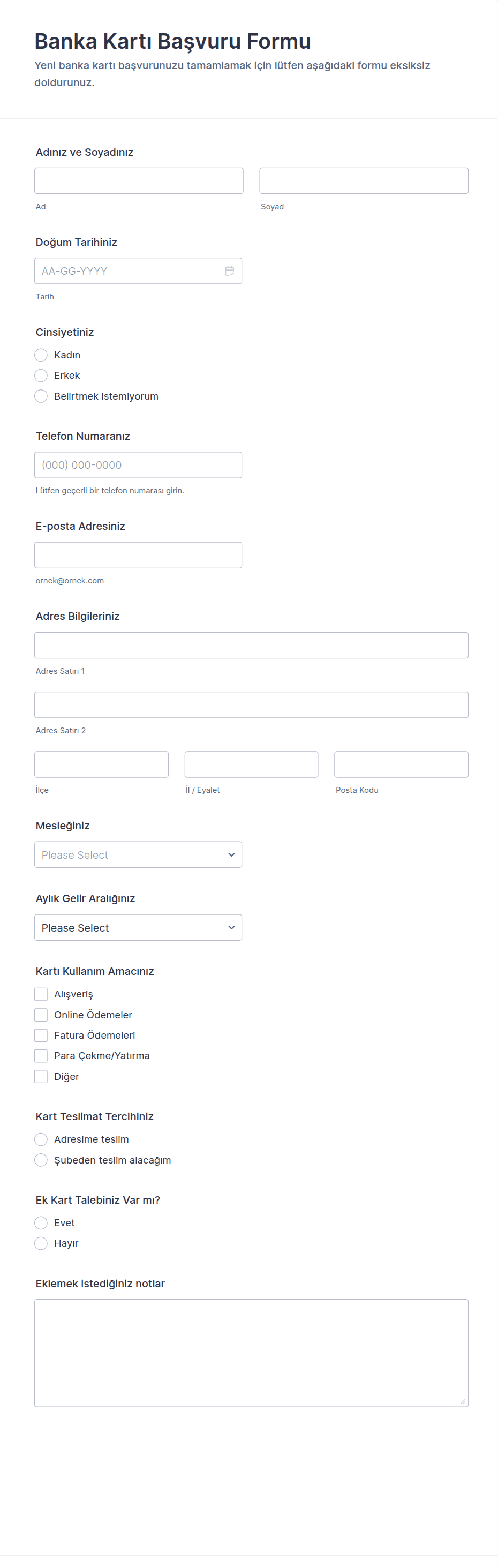 3. Banka başvuru formunda genellikle hangi bilgiler istenir?