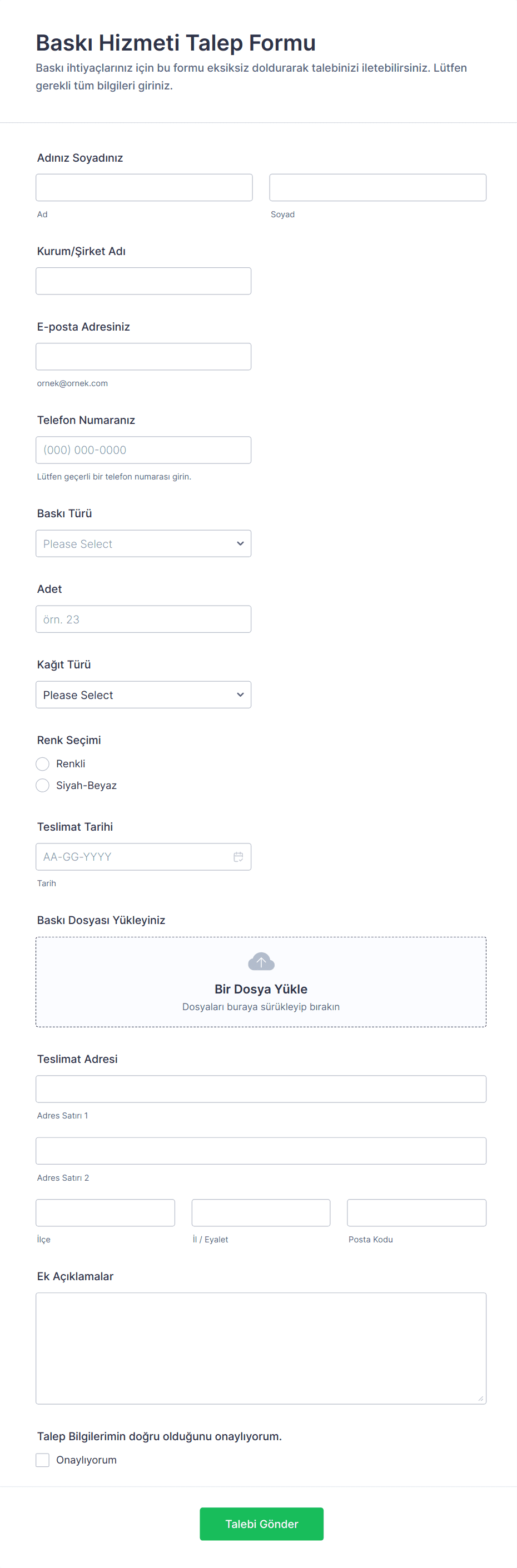 - Dosya yükleme (destekleyici belgeler veya görseller için)