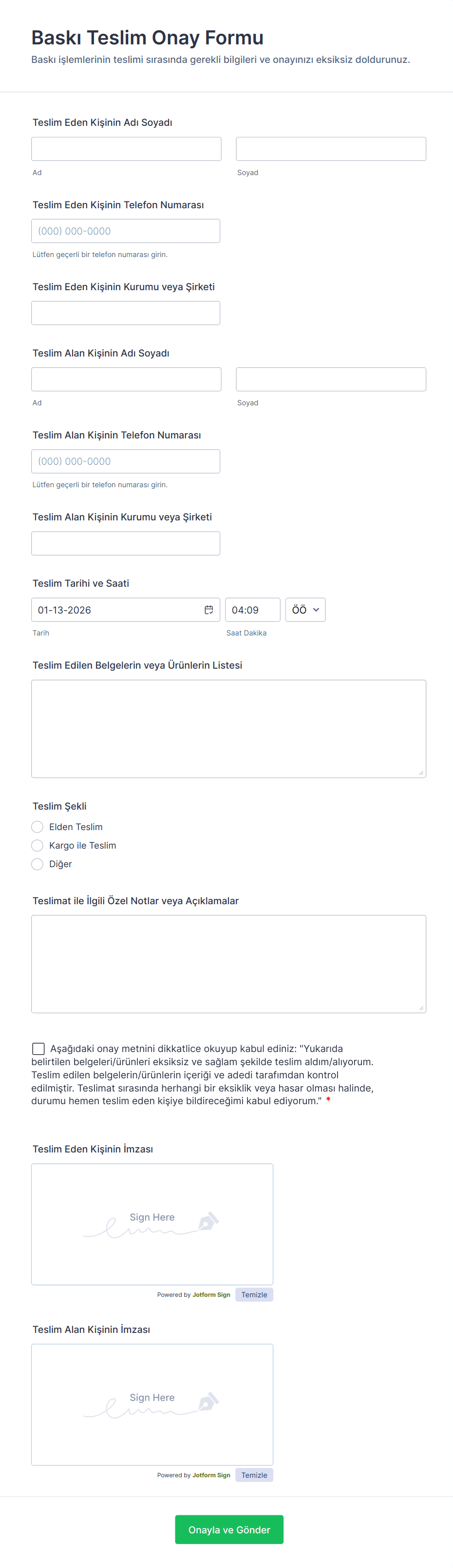 Baskı Teslim Onay Formu, basılı evrak ve ürün teslimlerini Jotform üzerinden kayıt altına alarak ekiplerin veri toplama ve form gönderimi süreçlerini düzenlemesine yardımcı olan bir form şablonudur.
