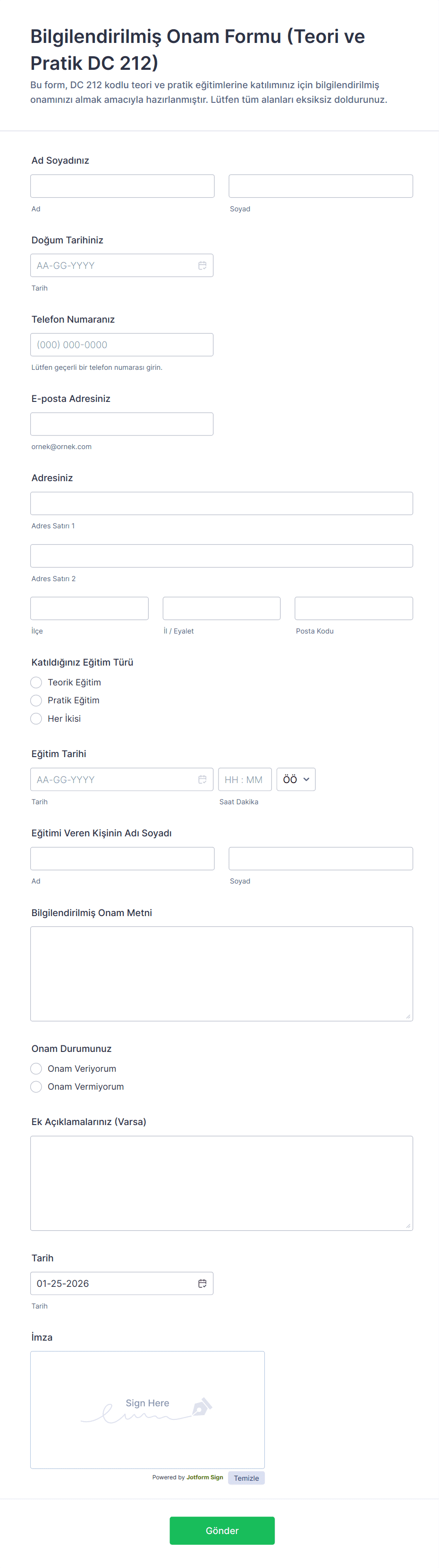 Bilgilendirilmiş Onam Formu Teori ve Pratik DC 212 ile eğitim ve uygulama süreçlerinde katılımcı onaylarını dijital olarak toplayın, form gönderimi kayıtlarını düzenli biçimde yönetin ve veri toplama sürecini hızlandırın.