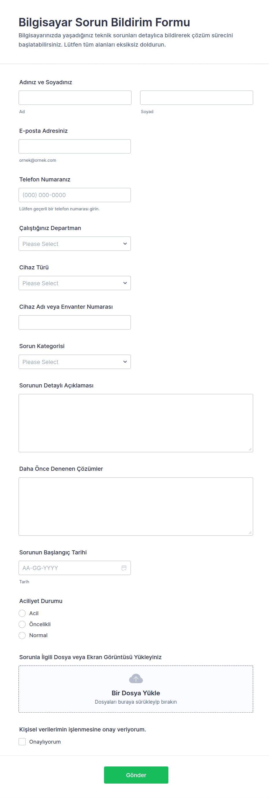 Gelen servis taleplerini yönetin ve teknik destek ekibiniz için yeni uzmanlar bulun. Bilişim teknolojileri alanında kullanabileceğiniz ücretsiz form şablonlarımız sayesinde BT departmanınızdaki işleri idare edebilirsiniz. Sürükle ve bırak özelliği olan Form Oluşturma Aracı'mız ile seçtiğiniz BT formu şablonunu kolayca özelleştirin ve yazılım hatalarını izleme, iş başvuruları alma ve geri bildirim toplama gibi birçok işinizi kolaylaştırın. Formlarınıza iş yönetim uygulamaları entegre ederek işlerinizi otomatik hâle getirebilirsiniz. Siz de kendi BT formunuzu tasarlayın ve iş akışınızı organize etmeye başlayın!