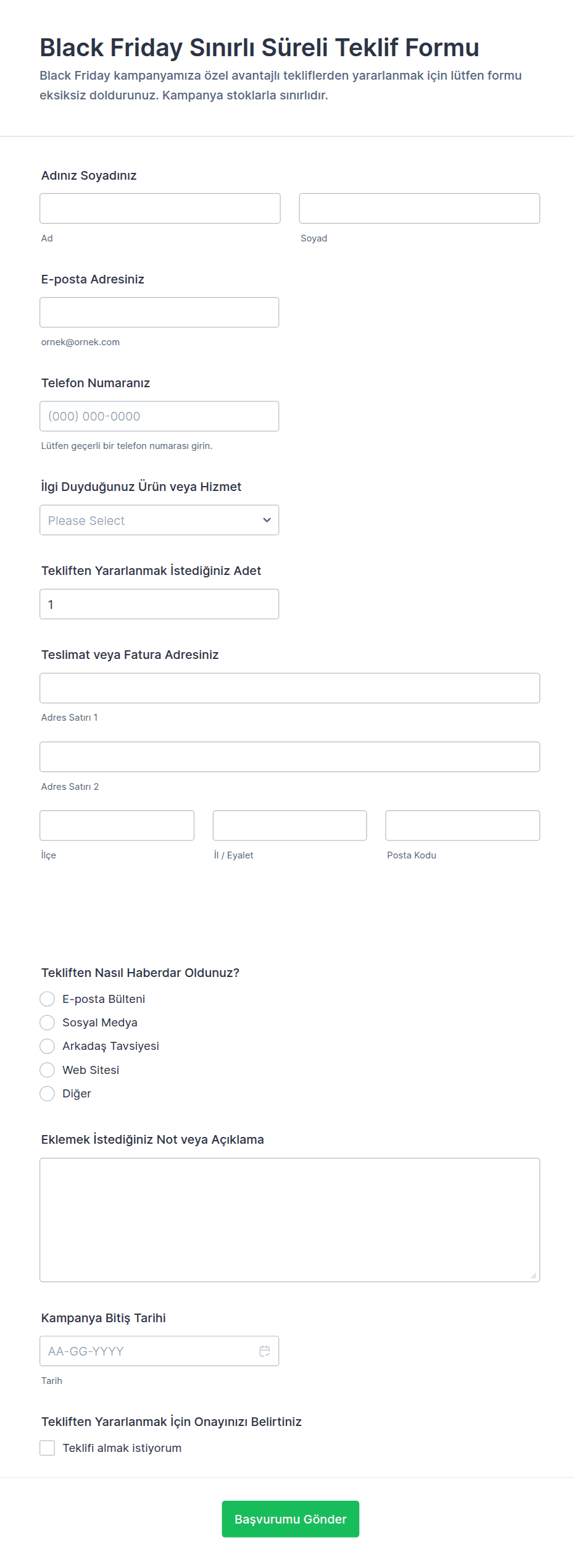Efsane Cuma Form Şablonları; işletmelerin, perakendecilerin ve kuruluşların Efsane Cuma alışveriş sezonundaki yoğun aktiviteyi verimli bir şekilde yönetmelerine yardımcı olmak için tasarlanmış özel online formlardır. Bu şablonlar, özel fırsatlar için müşteri kayıtlarını toplama, ön siparişleri işleme alma, etkinlik LCV'lerini yönetme, Efsane Cuma promosyonları hakkında geri bildirim toplama veya hatta sınırlı süreli yarışmalar ve çekilişler düzenleme gibi çeşitli amaçlar için kullanılabilir. Veri toplama işlemini kolaylaştıran ve iş akışlarını otomatikleştiren Efsane Cuma Form Şablonları, işletmelerin yüksek hacimli müşteri etkileşimlerini yönetmesine, envanteri takip etmesine ve hem müşteriler hem de personel için sorunsuz bir alışveriş deneyimi sağlamasına yardımcı olur.
