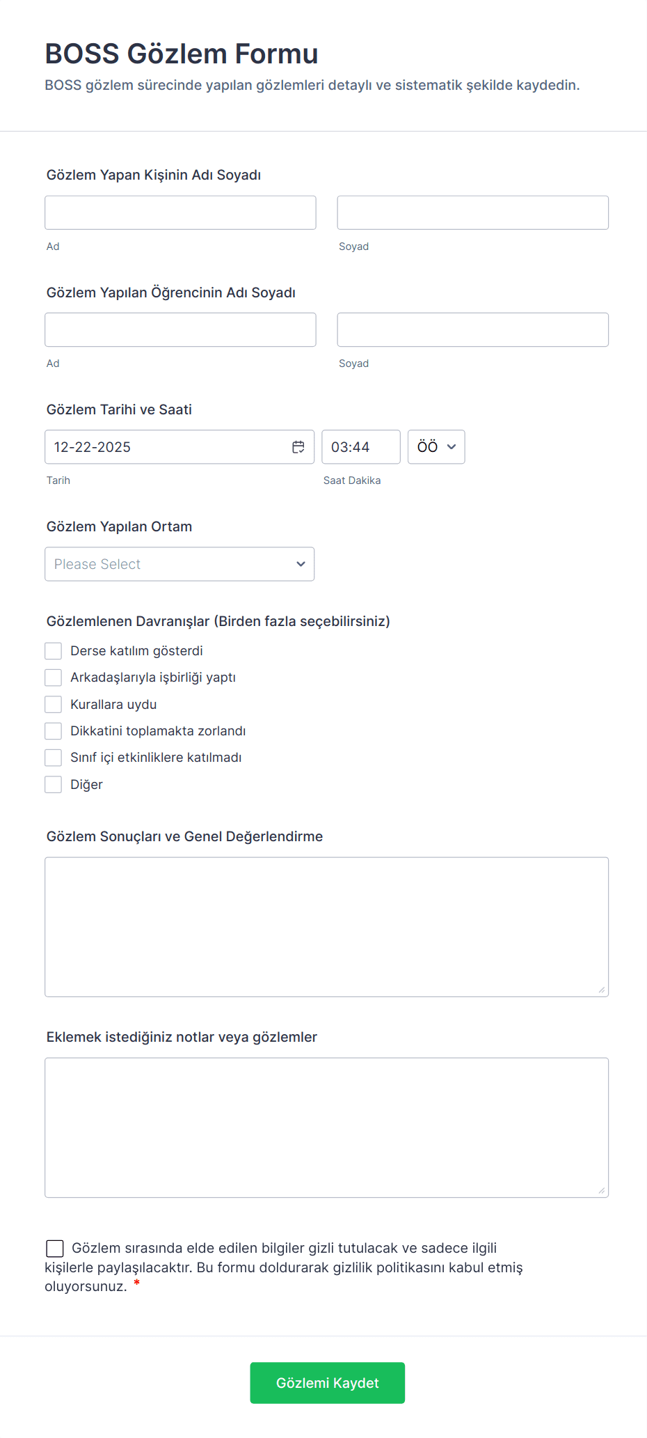 BOSS Gözlem Formu, öğretmenlerin, psikolojik danışmanların, özel eğitim uzmanlarının ve okul yöneticilerinin öğrencilerin davranışlarını sistemli bir şekilde kaydetmesine yardımcı olmak için tasarlanmıştır. Formda gözlem yapan kişinin adı soyadı, gözlem yapılan öğrencinin adı soyadı, gözlem tarihi ve saati gibi temel kimlik ve zaman bilgileri yer alır. Gözlem yapılan ortam açılır menüden seçilerek kayıtlar standartlaştırılır; “Gözlemlenen Davranışlar” çoklu seçim kutuları sayesinde birden fazla davranış aynı anda işaretlenebilir. “Gözlem Sonuçları ve Genel Değerlendirme” ile “Eklemek istediğiniz notlar veya gözlemler” alanları, ayrıntılı nitel değerlendirme ve ek açıklamalar için geniş metin kutuları sunar. Formun sonunda yer alan gizlilik ve koşul metni ise, gözlem sırasında elde edilen bilgilerin yalnızca ilgili kişilerle paylaşılacağını vurgulayarak tarafların bilgilendirilmiş onayını toplar.