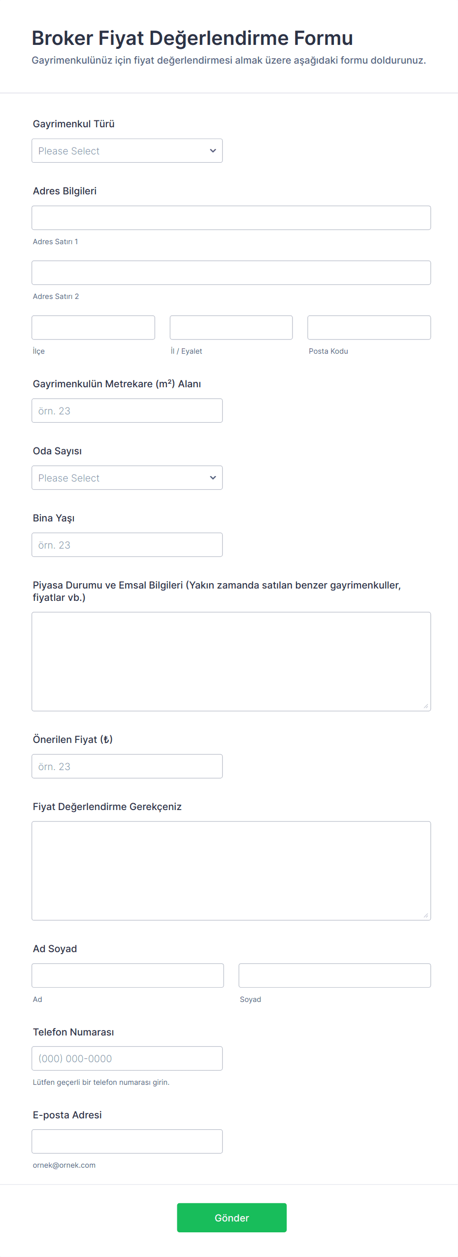 Broker Fiyat Değerlendirme Formu, emlak danışmanlarının gayrimenkuller için fiyat analizi yapmasını, emsal ve piyasa bilgilerini toplamasını ve önerilen fiyatları tek bir yerde düzenlemesini sağlar.