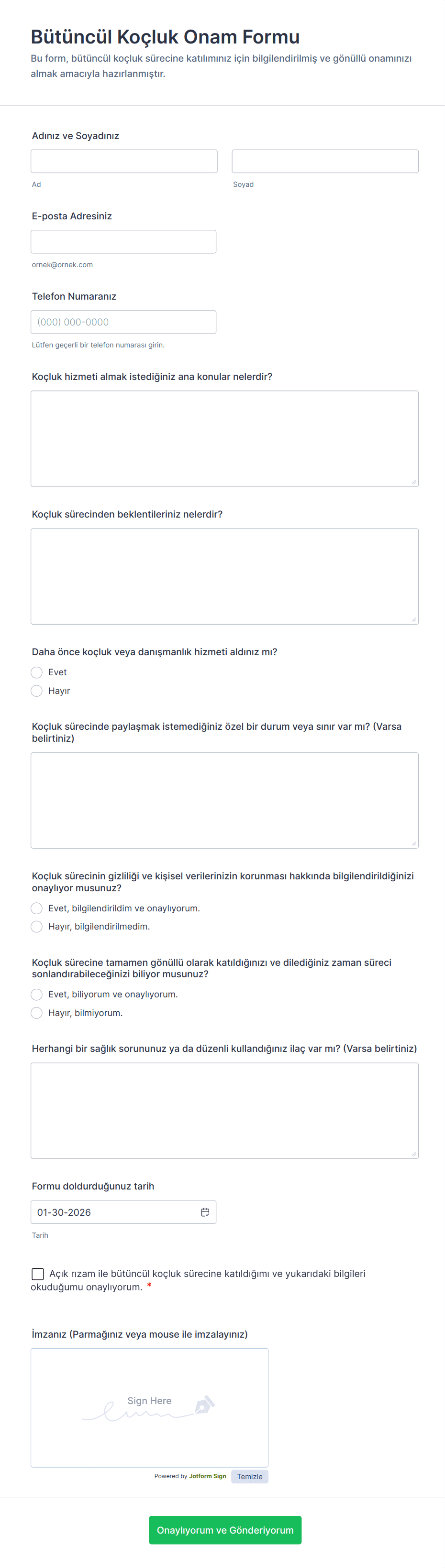 Bu adımları izleyerek, yasal gereklilikleri karşılayan, tüm tarafları koruyan ve onay sürecini kolaylaştıran bir onam formu oluşturabilirsiniz. Jotform'un esnek araçları ve güvenli altyapısı, formunuzu herhangi bir kullanım senaryosuna uyarlamanızı kolaylaştırarak, onayları verimli ve profesyonel bir şekilde toplamanızı ve yönetmenizi sağlar.