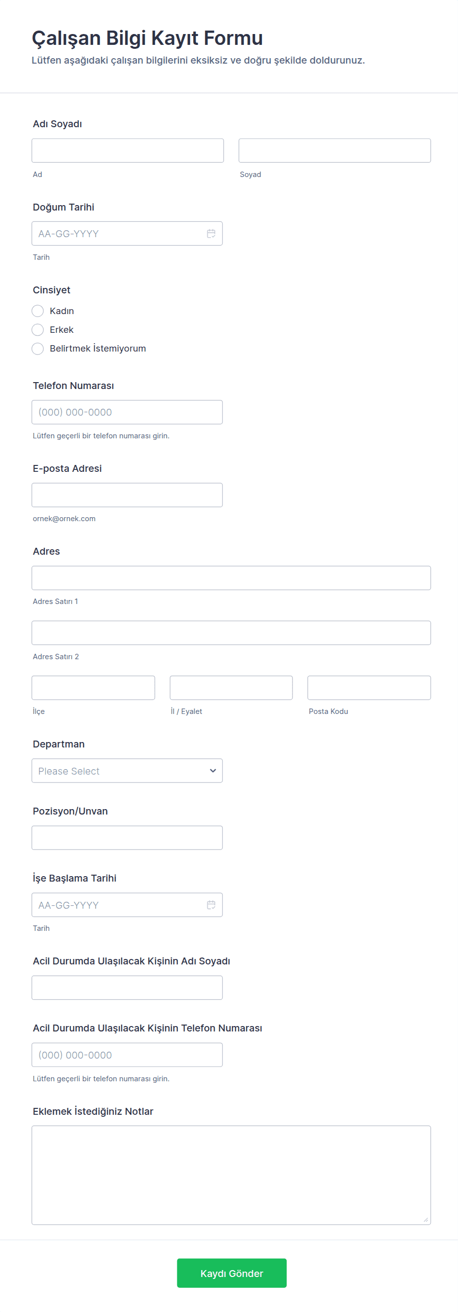 Evet, formlar işe alım, kayıt güncellemeleri, acil durum iletişim bilgileri, yan haklar kaydı ve işten ayrılma süreçleri için her bir kullanım durumuna özel alanlarla uyarlanabilir.