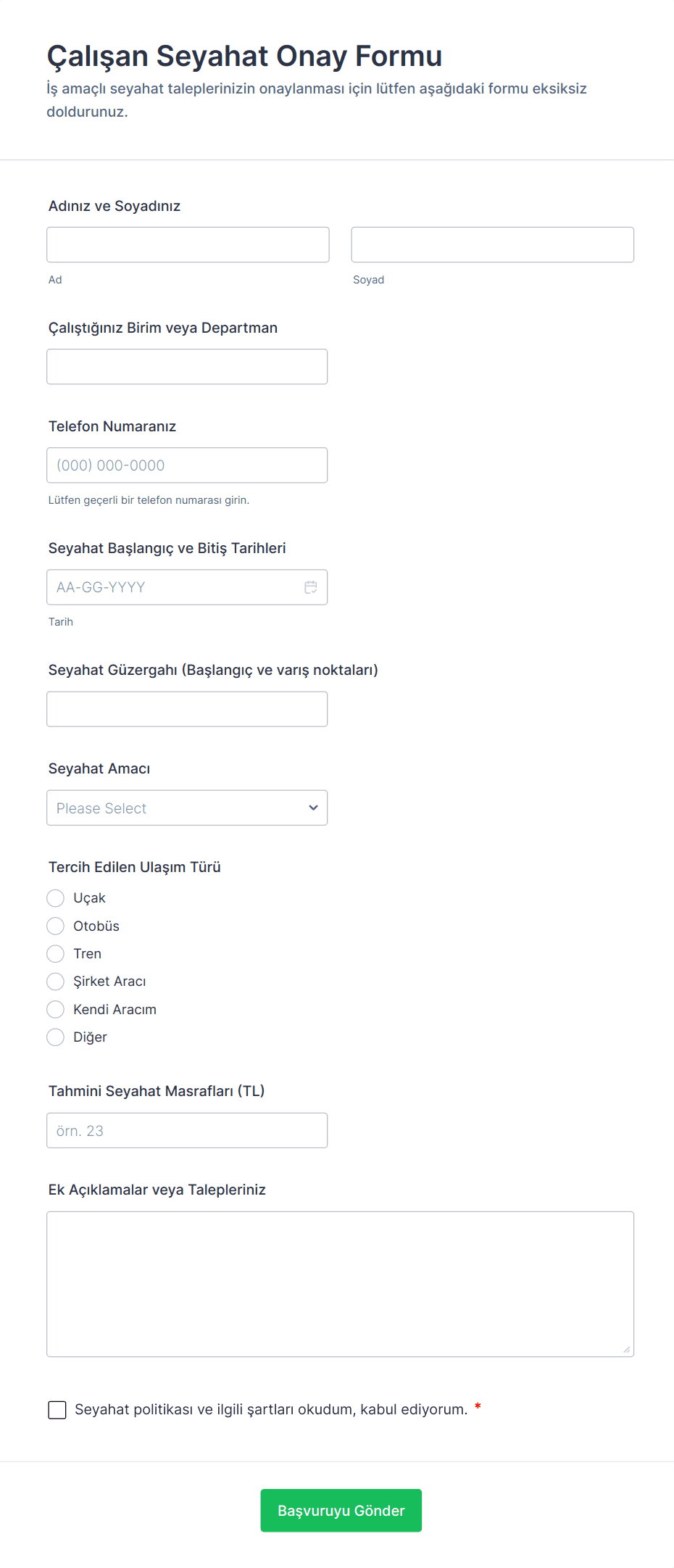 Çalışan Seyahat Onay Formu ile çalışanlarınızın seyahat tarihlerini, güzergahını, amacını, ulaşım türünü ve tahmini masraflarını Jotform Form Oluşturucu üzerinden kolayca toplayın ve onay sürecini düzenleyin.