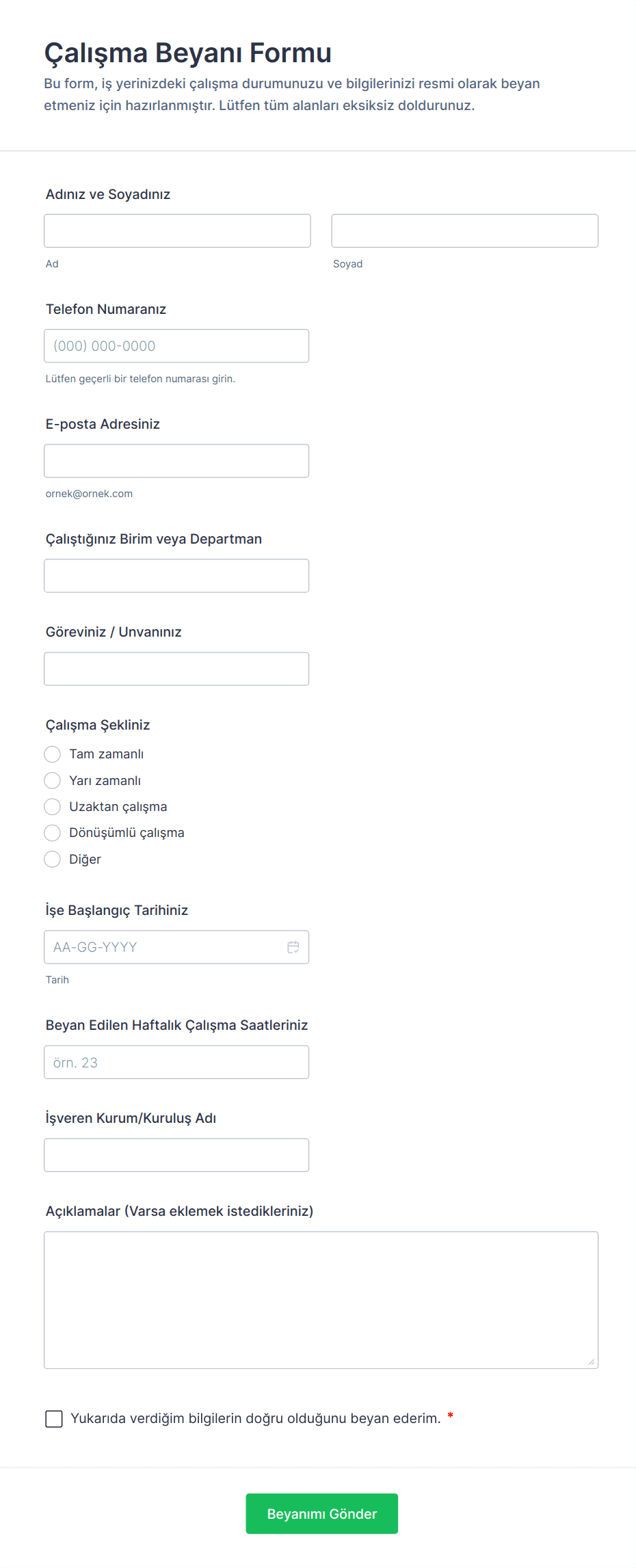 Çalışma Beyanı Formu ile çalışanların çalışma düzeni ve beyanlarını çevrim içi veri toplama sürecine taşıyın, form gönderimlerini Jotform üzerinden takip ederek kurum içi raporlama ve planlamayı kolaylaştırın.