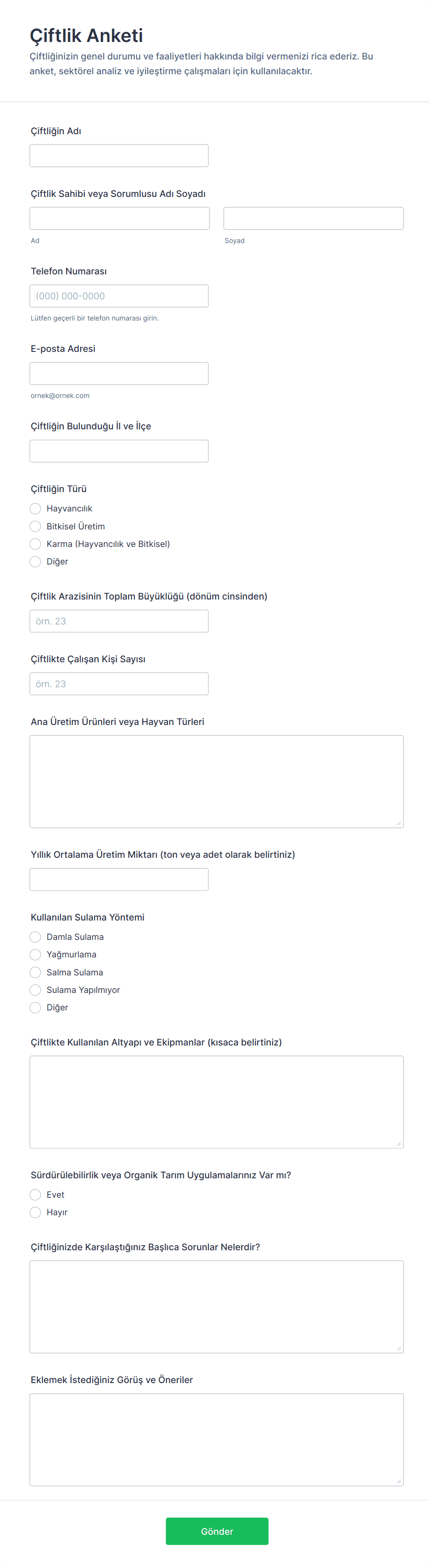 Çiftlik Anketi Formu, tarımsal işletmelerden veri toplama süreçlerini hızlandırmak isteyen kooperatifler, araştırmacılar ve kamu birimleri için kapsamlı bir form şablonu sunar.