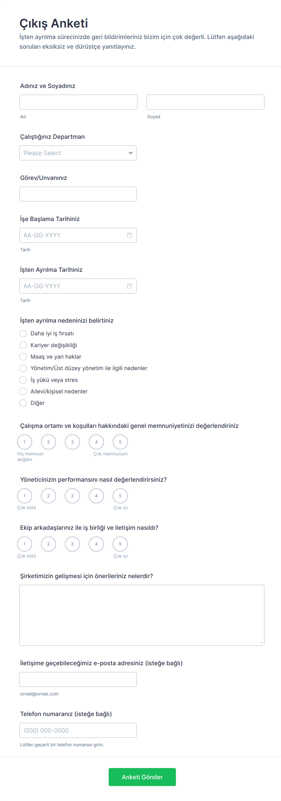 - Özel kullanım durumları için, çalışanın rolü veya ayrılma nedeniyle ilgili alanları ekleyin (örneğin, uzaktan çalışma araçları, proje devri veya eğitim deneyimleri hakkında sorular).