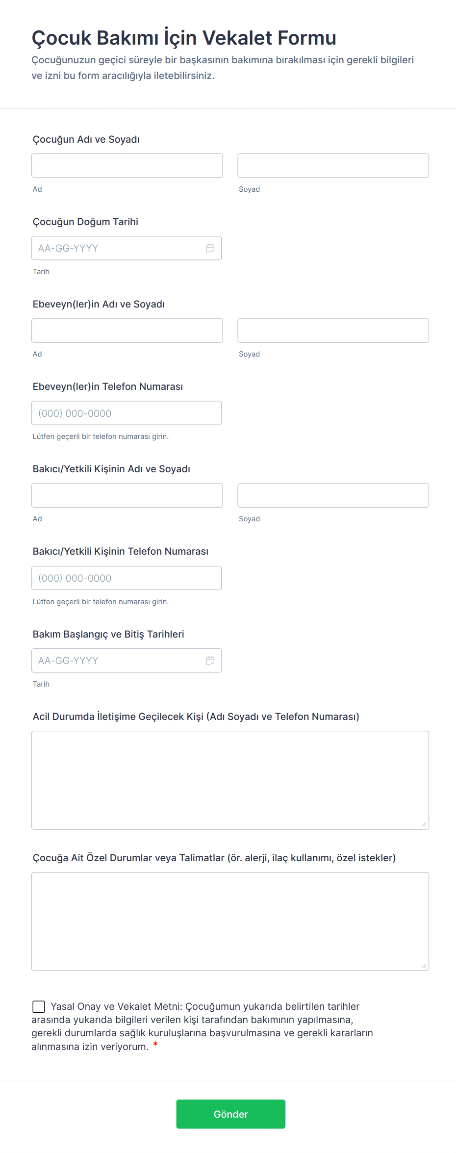 Bakıcı formları, ebeveyn iletişim bilgileri, çocukların tıbbi geçmişi ve reçeteleri, feragat sözleşmeleri, bakıcı iş başvuruları ve daha fazlası gibi çocuk bakım hizmetleriyle ilgili bilgi toplamak amacıyla kullanılan online formlardır. Çocuk bakım hizmetleriniz için bilgi, ödeme veya e-imza toplamanız mı gerekiyor? Herhangi bir cihazda anında kullanmak üzere kullanıma hazır bir Bakıcı Formu şablonu seçin.