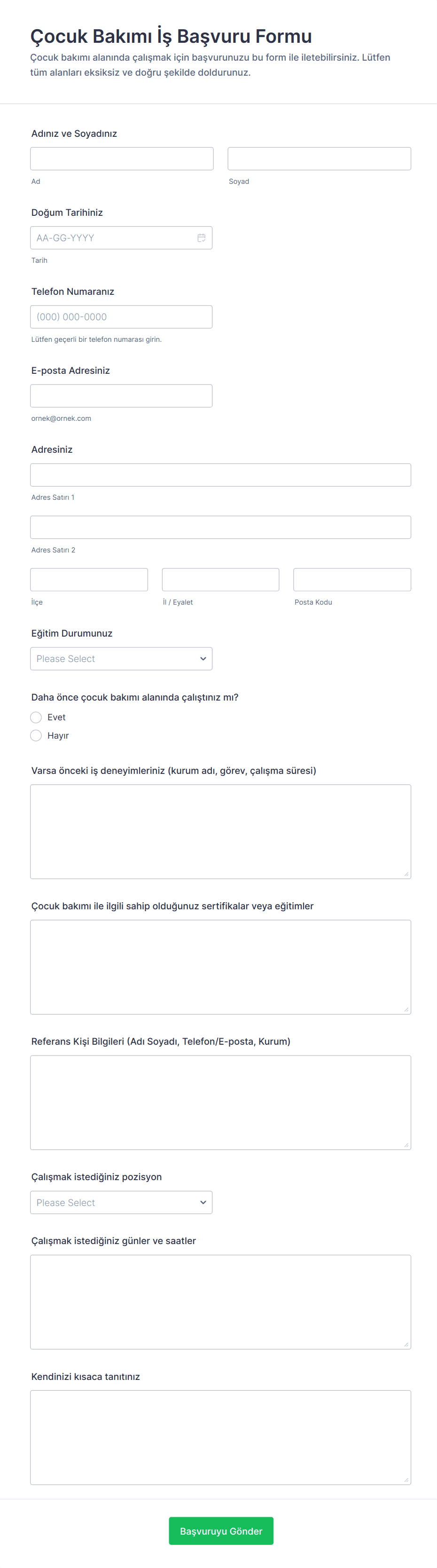 Çocuk Bakımı İş Başvuru Formu, ailelerin ve çocuk bakım kurumlarının aday başvurularını online olarak toplayıp değerlendirmesine yardımcı olan pratik bir form şablonu çözümüdür.