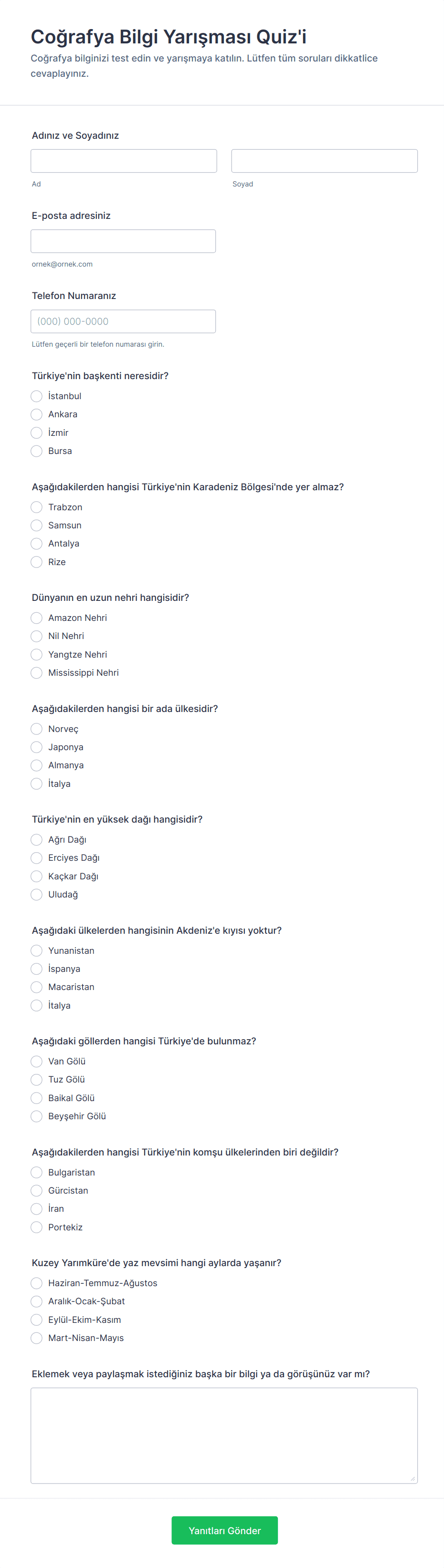 Quiz şablonları çoktan seçmeli, doğru/yanlış, açık uçlu ve görsel tabanlı soruların yanıtlarının yanı sıra katılımcıların ad, e-posta ve puanları gibi bilgilerini toplayabilir.