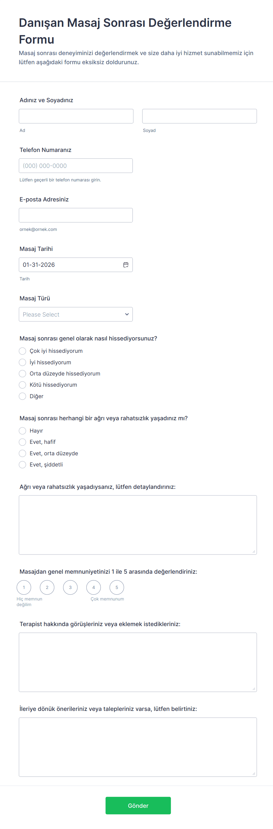 Müşteri Değerlendirme Formları, ürünler, hizmetler veya bir işletme ya da uzman ile olan genel deneyimler hakkında müşterilerden yapılandırılmış geri bildirim ve içgörü toplamak için tasarlanmış özel araçlardır. Bu formlar, hizmet sağlayıcılar, danışmanlar, kurumlar, sağlık uzmanları ve eğitim kurumları tarafından müşteri memnuniyetini değerlendirmek, geliştirilmesi gereken alanları belirlemek ve müşteri ilişkilerini güçlendirmek için yaygın olarak kullanılır. Kullanım alanları, proje sonrası değerlendirmelerden süregelen hizmet değerlendirmelerine, işe alım geri bildirimine ve işten çıkış görüşmelerine kadar uzanır. Müşteri girdilerini sistematik olarak toplayarak, kuruluşlar veri odaklı kararlar alabilir, hizmet kalitesini artırabilir ve sürekli iyileştirmeye olan bağlılıklarını gösterebilir.